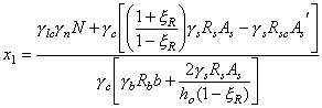 3.15. Проверка прочности прямоугольного сечения с одиночной арматурой производится в зависимости, от высоты сжатой зоны х, вычисляемой по формуле (29), следующим образом: 1) при x £ xRho - из условия glcgnM £ gcgbRbbx(ho - 0,5x); (39) 2) при x > xRho - из условия glcgnM £ gcgbRbxR(1 - 0,5xR)bho2; (40) При невыполнении условия (40) рекомендуется увеличить высоту сечения, повысить класс бетона или поставить сжатую арматуру в соответствии с п. 3.13. 3.16. Проверка прочности прямоугольного сечения с двойной арматурой производится в зависимости от высоты сжатой зоны х, вычисляемой по формуле (27)