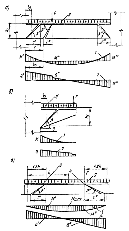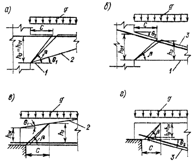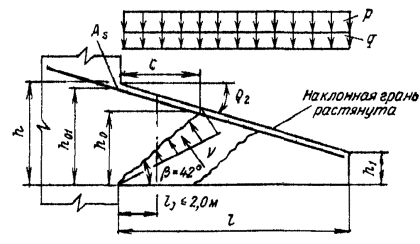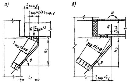 Примечание. lo - расчетная длина элемента, b - наименьший размер прямоугольного сечения, r - наименьший радиус инерции сечения. Прямоугольные сечения рассчитываются по формуле glcgnN £ 1,5jgcgb(0,5 - h)RbA, (14) где А = bh - площадь поперечного сечения элемента; h = eo/h - относительный эксцентриситет приложения нагрузки. В элементах прямоугольного сечения, рассчитываемых по формулам (12) и (14), значение эксцентриситета расчетного усилия относительно центра тяжести сечения не должно превышать 0,6у при основном сочетании нагрузок и при особом сочетании нагрузок, не включающем сейсмические воздействия, и 0,65у - при особом сочетании нагрузок, включающем сейсмические воздействия. Внецентренно сжатые бетонные элементы двутаврового, таврового, коробчатого и другой формы поперечного сечения, отличающейся от прямоугольника, при эксцентриситетах, выходящих за пределы ядра сечения, а также элементы прямоугольного сечения при е > 0,6у (или е > 0,65у) должны проверяться по условию недопущения образования продольных трещин откола glcgnsbt £ jgcghgbRbt, (15) где sbt - растягивающее напряжение, действующее по продольным площадкам на границе сжатой зоны. Растягивающие напряжения sbt, а также высота зоны hyt, в пределах которой они действуют, определяются в общем случае расчетом МКЭ. Для элементов прямоугольного сечения, изготовленных из бетона класса В20 и выше, проверку по условию недопущения образования продольных трещин откола можно не делать, если выполняется условие glcgnsbt £ 12jgcgbRbt, (16) б) при расчете с учетом сопротивления растянутой зоны сечения: glcgn glcgn где Wt, Wc - моменты сопротивления соответственно для растянутой и сжатой граней сечения; gh, gsh - коэффициенты, определяемые по п. 3.3. При определении коэффициентов gh и gsh высота растянутой зоны сечения находится в предположении упругой работы материала. Для элементов прямоугольного сечения По формуле (17) следует рассчитывать также внецентренно сжатые бетонные конструкции с однозначной эпюрой напряжений - при eo £ Wt/A. Формулы (4), (12)-(18) составлены для элементов с постоянной высотой сечения (т. с. призматических стержней). Этими формулами можно пользоваться и в том случае, когда угол между гранями элемента q £ arctg 0,2 » 11°. В этом случае напряжения на гранях элемента в нормальном к его оси сечении отличаются от краевых главных напряжений не более чем на 5 %, что допустимо в статическом расчете. В практических расчетах элементов бетонных конструкций приходится иметь дело со случаями, когда в расчетной схеме ось элемента не параллельна одной или обеим граням (см. рис. 2) и нельзя пренебречь углами q1 и q2. При этом без учета противодавления воды в сечении i-i формулы (17) и (18) заменяются следующими: glcgn glcgn где gw - объемный вес воды; Н, h - заглубления соответственно верховой и низовой точек расчетного сечения (см. точки А и В на рис. 2) под уровнями воды верхнего и нижнего бьефов. Расчетная длина элемента lо принимается в зависимости от характера закрепления его концов по табл. 15. Для арок расчетная длина элемента lо определяется умножением геометрической длины по оси арки l на коэффициент j2, вычисляемый по формулам: а) для бесшарнирных арок с жестко заделанными пятами
