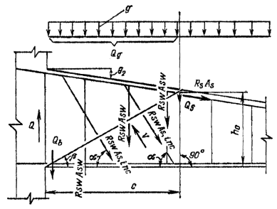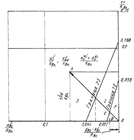 Определим далее коэффициенты gh и gsh. Для бетона класса В30 с = 5,5 см (см. табл. 13). Тогда по (5) gh = 1 + 5,5/42 = 1,13. По номограмме прил. 5 находим при hf/ht = 0,36 и bf - b/hf = 3,0, K = 0,41. Тогда по формуле (6) gsh = 1 - 0,41 (1 - 1/1,13) = 0,95. Подставив найденные величины в формулу (4), проверяем условные прочности нормального сечения 1,2×1,0×0,055 < 1,0×0,9×1,13×0,95×1,20×0,059; 0,0660 < 0,0684. Условие прочности на действие изгибающего момента выполняется. Поскольку в расчетном сечении балки имеет место одновременное действие изгибающего момента и перерезывающей силы, а поперечное сечение балки имеет сложную форму, требуется проверка прочности балки на восприятие главных растягивающих напряжений. Наиболее опасными с точки зрения образования трещин от действия главных растягивающих напряжений являются зоны стенки балки на уровне нейтральной оси (точка А) и на уровне верха растянутой полки (точка В). В точке А: sх = 0, sу = 0.