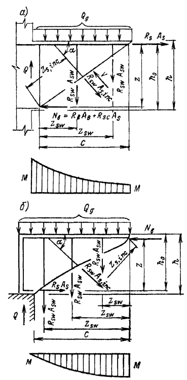 3.10 (5.11). Если высота сжатой зоны бетона, определяемая без учета сжатой арматуры, меньше 2а¢, то сжатую арматуру в расчете можно не учитывать. Для массивных конструкций при высоте сжатой зоны бетона больше 2а¢, но значительно меньше величины xR ho рекомендуется определять количество растянутой продольной арматуры без учета поставленной в сжатой зоне бетона арматуры. Расчетную сжатую арматуру рекомендуется применять при ограниченной высоте сечения, невозможности повышения класса бетона или при каких-либо особых требованиях. Изгибаемые элементы3.11 (5.12). Расчет изгибаемых железобетонных элементов любой симметричной формы (рис. 10, а) при x £ xR производится по формулам: glcgnМ £ gс(gbRbSb + gsRscSs); (24) gsRsАs - gsRscАs¢ = gbRbАb. (25) Расчет прямоугольных сечений3.12. (5.13). Изгибаемые элементы прямоугольного сечения (рис. 10, б) рассчитываются при x £ xR по формулам: glcgnМ £ gс[(gbRbbx(ho - 0,5x) + gsRscA¢s(ho - a¢)]; (26) gsRsАs - gsRscАs¢ = gbRbbx. (27) При x > xR расчет элементов производится по тем же формулам при х = xR hо. 3.13. Площадь сечения продольной арматуры определяется следующим образом. Вычисляется высота сжатой зоны сечения из условия (26) при A¢s = 0 Далее различают следующие схемы расчета: 1) в случае, если х < 2а¢, расчет производится как для сечения с одиночной арматурой при A¢s = 0 по формуле 2) в случае, если 2а¢ £ x £ xRho, при известной площади сечения сжатой арматуры A¢s высота сжатой зоны бетона уточняется по формуле Рис. 10. Схема усилий и эпюра напряжений в сечении, нормальном к продольной оси изгибаемого железобетонного элемента, при расчете его на прочность а - сечение любой симметричной формы; б - прямоугольное сечение Площадь сечения растянутой арматуры определяется из условия Если высота сжатой зоны, найденная по формуле (30), х < 2а¢, а сечение A¢s неизвестно или равно As (сечение с симметричной арматурой), количество продольной арматуры допускается определять по формуле 3) в случае, если х > xRho, рекомендуется увеличить высоту сечения, повысить класс бетона или поставить сжатую арматуру в количестве Растянутая продольная арматура в этом случае определяется по формуле 3.14. Подбор площади продольной арматуры можно производить по табл. 17 следующим образом. Вычисляется значение am: Если В зависимости от значения am по табл. 17 определяется и вычисляется Таблица 17