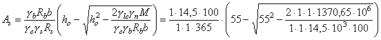 Пример 15. Дано. Прямоугольное сечение с одиночной арматурой: gс = 1,0; b = 100 см; h = 80 см; а = 6 см; ho = 74 см; бетон класса В25 (Rb = 14,5 МПа, gb = 1,1); арматура класса A-III (Rs = 365 МПа, gs = 1,1); M = 3300 кН×м; сооружение III класса (gп = 1,15); сочетание нагрузок основное (glc = 1,0). Требуется определить площадь сечения растянутой арматуры. Расчет. Высоту сжатой зоны бетона находим по формуле