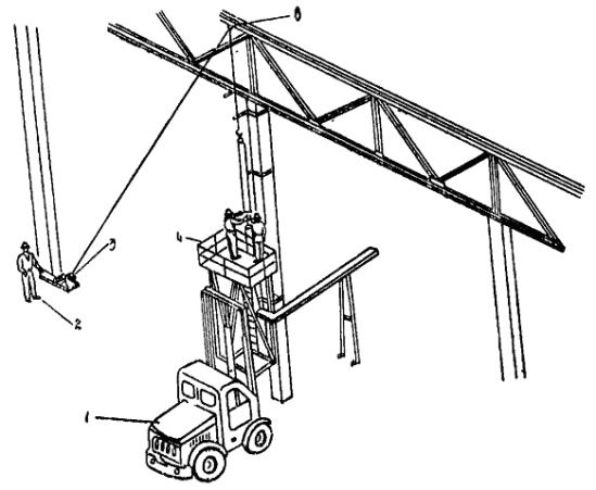 Рис. 17. Прокладка магистрального шинопровода поперек нижнего пояса металлических ферм: 1 - шинопровод; 2 - стойка К885; 3 - нижний пояс металлической фермы Рис. 18. Прокладка магистрального шинопровода на напольных стойках: 1 - напольная стойка К882 (или У2132); 2 - шинопровод Рис. 19. Монтаж блоков магистрального шинопровода с использованием лебедки: 1 - крепежная конструкция; 2 - подъемный ролик; 3 - траверса; 4 - электромонтажники третьего и четвертого разрядов; 5 - веревочная оттяжка (пеньковый канат диаметром 11 мм); 6 - электромонтажник шестого разряда; 7 - автогидроподъемник АГП-12А (АГП-15); 8 - двухосный прицеп; 9 - контейнер; 10 - электромонтажник третьего разряда; 11 - рама для установки лебедки; 12 - электромонтажник шестого разряда; 13 - лебедка с электроприводом Рис. 20. Монтаж блоков шинопровода с использованием самоходных выдвижных подмостей ПВС-8 (ПВС-12): 1 - автопогрузчик; 2 - электромонтажник второго разряда; 3 - веревочная оттяжка (пеньковый канат диаметром 7 мм); 4 - траверса; 5 - контейнер; 6 - электромонтажник шестого разряда; 7 - крепежная конструкция; 8 - электромонтажники третьего и четвертого разрядов; 9 - козлы; 10 - самоходные выдвижные подмости ПВС-8 (ПВС-12); 11 - электромонтажник третьего разряда; 12 - двухосный прицеп 2.44. Монтаж шинопроводов на высоте до 6 м в помещениях с нестесненными условиями производят с самоходных выдвижных подмостей ПВС (рис. 20) или телескопических катучих подмостей ПТК. 2.45. При наличии в Монтажной зоне автокрана его следует использовать для монтажа шинопровода (рис. 21). 2.46. При монтаже опорных конструкций и вертикальных участков шинопровода наряду с указанными средствами механизации можно использовать автопогрузчик со специальной монтажной площадкой (рис. 22, 23). 2.48. Операции по стыковке смежных секций (блоков), установленных на проектной отметке, следует выполнять аналогично изложенному в пп. 2.21-2.31 настоящей инструкции. При этом в отверстие для стяжного болта необходимо с целью фиксации вставлять оправку, представляющую собой отрезок трубы соответствующего диаметра. Рис. 21. Монтаж блоков магистрального шинопровода с использованием автокрана АК-7,5 (МКА-10): 1 - автокран АК-7,5 (МКА-10); 2 - электромонтажник второго разряда; 3 - лестница Л-312; 4 - электромонтажник четвертого разряда; 5 - траверса; 6 - электромонтажник третьего разряда; 7 - электромонтажник шестого разряда; 8 - крепежная конструкция; 9 - контейнер; 10 - двухосный прицеп; 11 - электромонтажник третьего разряда; 12 - веревочная оттяжка (пеньковый канат диаметром 11 мм) 2.49. Секции шинопровода можно стыковать также болтовыми сжимами в соответствии с п. 2.21 настоящей инструкции. Перед сборкой болтового сжима следует подготовить контактные поверхности шин в соответствии с требованиями инструкции [7]. 2.50. Сборку болтового сжима осуществляют в следующем порядке (рис. 24): после подготовки контактных поверхностей шин совмещают концы стыкуемых секций, обеспечив точное совпадение отверстий и правильное положение изгибов. Эту операцию выполняют стальным направляющим стержнем с конусной заточкой; трубчатый изолятор вставляют в отверстия двух крайних шин, а два круглых изолятора и шайбы (рис. 25) - в просвет между этими двумя шинами и следующей группой шин; трубчатый изолятор продвигают в отверстия шайб, круглых изоляторов и следующей группы шин; на концы трубчатого изолятора надевают гетинаксовые пр