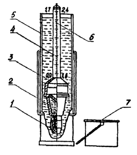 Для сложных систем буровых растворов, содержащих соль, нефть, глину, утяжелитель, определение концентрации твердой фазы, нефти и других компонентов производится с помощью установки ТФН-1, принцип работы которой основан на выпаривании жидкой фазы из заданного объема бурового раствора, конденсации паров и измерении объема жидкой фазы. Основные характеристики установки ТФН-1: объем выпариваемой пробы бурового раствора, см3 10; температура нагрева пробы бурового раствора, °С 450 ± 50; продолжительность анализа, не более, мин 60; основная приведенная погрешность определения концентрации твердой и жидкой фаз в буровом растворе, не более, % 4; напряжение питания, В 220. Порядок работы: Определение концентрации твердой фазы в пробе бурового раствора при наличии аналитических весов ВЛР-200-Т или квадрантных весов ВЛКТ-500г/10 производится весовым методом: определить путем взвешивания на весах массу собранного испарителя без пробы; отвинтить нижнюю камеру испарителя, наполнить ее буровым раствором, закрыть калибровочной крышкой, свинтить с верхней камерой и снова взвесить; соединить испаритель с конденсатором, произвести затяжку резьбовых соединений и вставить в гнездо термостата; установить измерительный цилиндр против сливного отверстия конденсатора; закрыть крышку кожуха и включить установку в сеть на нагрев, начало нагрева контролировать по загоранию сигнальной лампочки на передней панели; окончанием анализа служит прекращение выпадения капель конденсата в измерительный цилиндр, после прекращения выпадения капель отключить питание электродвигателя; открыть крышку кожуха установки, извлечь из термостата испаритель с конденсатором и установить его в подставку для охлаждения, вставить в термостат охладитель, предварительно наполненный водой; полученные конденсатные объемы воды и нефти считываются с точностью до 0,1 см3 по градуировочной шкале измерительного цилиндра в соответствии с положениями менисков; по окончании измерений измерительный цилиндр освободить от конденсата, высушить и подготовить для проведения следующего анализа; после охлаждения испаритель с твердым остатком отсоединить от конденсатора и взвесить. В том случае, если отсутствуют весы ВЛР-200-Т или ВЛКТ-500г/10, применяется объемный метод, для которого необходимо иметь весы-плотномер ВРП-1 (или пикнометр). Определение концентрации твердой и жидкой фазы производится следующим образом: определить с помощью ВРП-1 или пикнометра плотность бурового раствора, подлежащего анализу; наполнить нижнюю камеру испарителя буровым раствором, прикрыть калибровочной крышкой, произвести сборку испарителя с конденсатором и вставить их в термостат, включить установку на нагрев; после окончания выпаривания, компенсации, прокаливания и прекращения отекания капель конденсата установку отключить от электропитания; испаритель и конденсатор извлечь из термостата и произвести охлаждение; определить с точностью до 0,1 см3 полученные в измерительном цилиндре конденсатные объемы воды и нефти. Если использовался весовой метод, то обработка данных производится следующим образом: плотность бурового раствора рассчитывается по формуле