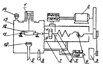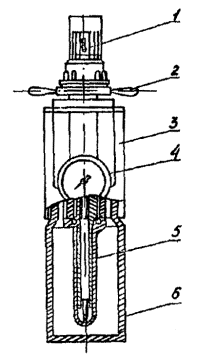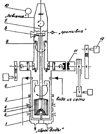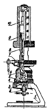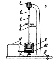 где rист - истинная плотность, г/см3; r - кажущаяся плотность, г/см3; Vг - объем газов, % (определяется согласно п. 3.12). 3.2. Определение условной вязкостиУсловная вязкость УВ, с - величина, определяемая временем истечения из стандартной воронки определенного объема бурового раствора. Условная вязкость косвенно характеризует гидравлическое сопротивление течению, т.е. подвижность бурового раствора. Для измерения условной вязкости используется вискозиметр ВБР-1, который состоит из мерной кружки и воронки. Основные характеристики: постоянная вискозиметра (время истечения 500 см3 воды при температуре (20 ± 5) °C, с 15; погрешность постоянной вискозиметра, с ±0,5; вместимость воронки вискозиметра, см3 700; вместимость мерной кружки, см3 500. Порядок работы: промыть водой воронку вискозиметра и мерную кружку (при работе с растворами на водной основе); закрыть отверстие трубки пальцем и налить в воронку через сетку испытуемый буровой раствор до перелива; подставить мерную кружку под трубку вискозиметра и, убрав палец, открыть отверстие трубки, одновременно включив секундомер; в момент заполнения кружки раствором до краев остановить секундомер, закрыть отверстие трубки пальцем и прочесть показания секундомера; после измерения кружку и воронку вымыть. В начале каждой смены, а также по мере надобности необходимо производить проверку водного числа вискозиметра. Время истечения 500 см3 чистой пресной (дистиллированной) воды при температуре (20±5) °С должно быть равным 15 с. Если значение будет больше 15 с, то трубку вискозиметра надо прочистить, если меньше - вискозиметр следует заменить. 3.3. Определение статического напряжения сдвига при нормальной температуреСтатическое напряжение сдвига (СНС) q, Па - величина, определяемая минимальным касательным напряжением сдвига, при котором начинается разрушение структуры в покоящемся буровом растворе. СНС характеризует прочность тиксотропной структуры и интенсивность упрочнения во времени. Для измерения СНС могут быть использованы: прибор СНС-3 (рис. 3); ротационный вискозиметр ВСН-3 (рис. 4). Прибор СНС-2 1 - плита-основание; 2 - внешний цилиндр; 3 - кронштейн; 4 - диск со шкалой; 5 -трубка; 6 - упругая нить; 7 - подвеска; 8 - стойка; 9 - подвесной цилиндр; 10 - вращающийся столик; 11 - установочный винт; 12 - электродвигатель Рис. 3 Принцип работы этих приборов основан на измерении сдвиговых напряжений в контролируемой среде, расположенной между соосными цилиндрами. Мерой сдвиговых напряжений является угол поворота подвесного цилиндра вокруг своей оси. 3.3.1. Прибор СНС-2 Основные характеристики: пределы измерений, Па (мГ/см2): при диаметре нити 0,3 мм 0-4 (0-40); при диаметре нити 0,4 мм 0-10 (0-100); при диаметре нити 0,5 мм 0-20 (0-200); основная приведенная погрешность измерения, % ±3; допускаемая продолжительность измерения, с 60; частота вращения внешнего цилиндра, мин-1 (об/мин) 0,2 (0,2); питание электродвигателя от сети переменного тока напряжением, В 220. Порядок работы: поместить подвесной цилиндр 9 во внешний цилиндр 2 и подвесить нить 6 на пробку; тщательно перемешать пробу бурового раствора; залить раствор меркой, прилагаемой к прибору, в установленный на вращающемся столике 10 внешний цилиндр, подвесной цилиндр при этом должен быть погружен в раствор точно до верхнего края; быстро установить «0» шкалы 4 против риски указателя и пустить секундомер; через 1 мин ос
