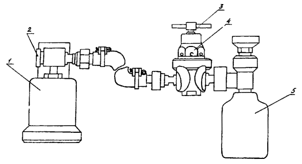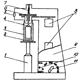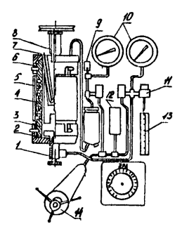 Кривая зависимости j от n Рис. 6 где h¢ - эффективная вязкость Па×с (сП); А, В - константы (приводятся в паспорте на прибор); h - пластическая вязкость, Па×с (сП); j2 - угол поворота шкалы, измеренный при большей частоте вращения цилиндра n2, град; j1 - угол поворота шкалы, измеренный при меньшей частоте вращения цилиндра n1, град; tо - динамическое напряжение сдвига, Па (мГ/см2); j - угол поворота шкалы при частоте вращения цилиндра 600 мин-1, град. Упрощенная методика работы с прибором: используется лишь две частоты вращения цилиндра 600 и 300 мин-1 или 400 и 200 мин-1 для получения значений j1, n1 и j2, n2; расчет пластической вязкости nпл и динамического напряжения сдвига tо производится по следующим формулам: а) для пружины № 1 при использовании частоты вращения 600 и 300 мин-1 h = 0,5(j2 - j1), (10) tо = 1,5(j1 - h); (11) при использовании частоты вращения 400 и 200 мин-1 h = 0,75(j2 - j1), (12) tо = 1,5j1 - 2h; (13) б) для пружины № 2 при использовании частоты вращения 600 и 300 мин-1 h = j2 - j1, (14) tо = 3(j1 - h); (15) при использовании частоты вращения 400 и 200 мин-1 h = 1, 5(j2 - j1), (16) tо = 3j1 - 2h; (17) Примечание. Определение пластической вязкости h и динамического напряжения сдвига tо, имеет смысл только в том случае, когда течение исследуемых буровых растворов в зазоре вискозиметра описывается моделью Шведова-Бингама. Поэтому при измерении реологических характеристик неизвестных буровых растворов всегда необходимо определять углы закручивания шкалы на частотах вращения цилиндра 600, 400, 300, 200 мин-1, а использовать упрощенные формулы расчета рекомендуется только тогда, когда равновесные моменты лежат на прямолинейной части графика. 3.6. Определение динамического напряжения сдвига, эффективной и пластической вязкости при повышенной температуреДля определения этих параметров используется ротационный вискозиметр ВСН-2М (см. рис. 5). Основные характеристики приведены в п. 3.4. Порядок работы: перед измерением контейнер 5 заполнить исследуемым буровым раствором в количестве 100 см3 и подсоединить к автоклаву 6; установить по манометру 10 необходимое давление, но не выше 15 МПа; включить прибор и установить частоту вращения наружного стакана 3, равной (400-500) мин-1; нагреть буровой раствор до требуемой температуры и довести частоту вращения наружного стакана до 600 мин-1; снять устойчивые показания углов поворота шкалы при следующих фиксированных частотах вращения стакана: 600, 500, 400, 300, 200, 100 мин-1; построить по полученным данным график. Обработка полученных данных аналогична используемой для ВСН-3 (п. 3.5) при обычной методике измерений. 3.7. Определение показателя фильтрации при нормальной температуреПоказатель фильтрации Ф, см3 - величина, определяемая объемом дисперсионной среды, отфильтрованной за определенное время при пропускании бурового раствора через бумажный фильтр ограниченной площади. Показатель фильтрации косвенно характеризует способность бурового раствора отфильтровываться через стенки ствола скважины. Для измерения показателя фильтрации могут быть использованы: фильтр-пресс ФЛР-1 (рис. 7); прибор ВМ-6 (рис. 8); прибор ВГ-1М. Принцип работы этих приборов основам на способности дисперсионной среды отфильтровываться под давлением из бурового раствора. 3.7.1. Фильтр-пресс ФЛР-1 Основные характеристики: предел измерения объема фильтрата за 30 мин при диаметре фильтра 75 мм, см3 120; погрешность измерения, см3 0,5; давление фильтрации, МПа (кГ/см2) 0,7 (7