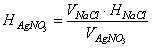 где V1 - объем раствора комплексона, израсходованного на титрование Са2+ + Mg2+, мл; V - объем раствора комплексона, израсходованного на титрование Са2+, мл; Р - нормальность раствора трилона Б; а - объем пробы, взятой для анализа, мл. 3.20.3. Определение хлор-иона Определение хлор-иона производится аргентометрическим и меркуриметрическим методами. Аргентометрический метод Метод основан на взаимодействии хлор-ионов с ионами серебра в присутствии хромат-ионов. Необходимые реактивы: азотнокислое серебро, 0,1 и 0,01 н. титрованный раствор; для приготовления 0,1 н. раствора 17 г AgNO3 поместить в мерную колбу вместимостью 1000 мл и довести до метки дистиллированной водой; нормальность и титр раствора установить по хлористому натрию, для чего взять определенные объемы титрованного раствора NaCl и титровать приготовленным раствором AgNO3 с индикатором хромовокислым калием до появления неисчезающей кирпично-красной окраски; нормальность раствора вычислить по формуле