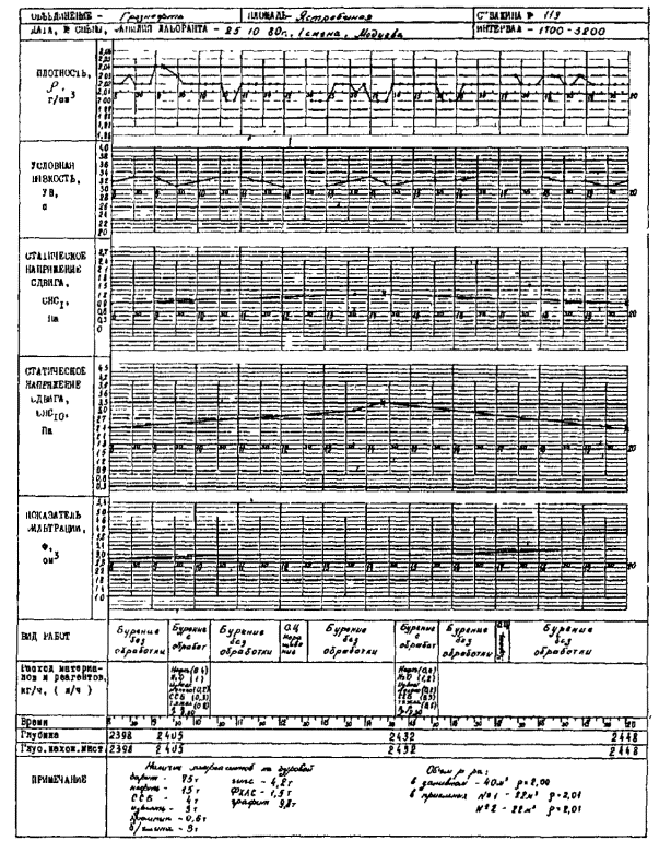 Приложение 6Подготовка контрольных карт к работеПодготовка контрольных карт к работе производится лаборантом цеха промывочных жидкостей (или лаборантом на буровой) на основании рассчитанных данных (см. приложение 4). Вверху бланка указывается наименование объединения и площади, номер скважины и глубина интервала бурения. Вдоль вертикальной оси на каждой контрольной карте в произвольном масштабе, выбираемом в зависимости от значений предупреждающих и внешних границ регулирования, наносятся значения контролируемых параметров. Проектные значения наносятся в центре контрольных карт. Параллельно оси времени напротив соответствующих значений пунктирными линиями проводятся предупреждающие границы, сплошными жирными линиями проводятся внешние границы. Для удобства ведения контрольных карт рекомендуется для каждого параметра в соответствии с планом контроля (см. приложение 5) нанести на каждую карту отметки времени, в которые будут производиться отборы проб для измерения данного параметра. Приложение 7Пример заполненного бланка контрольных карт