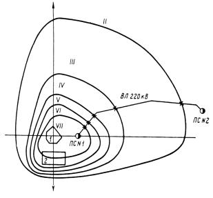 Как следует из рис. 6, подстанция № 1 располагается в зоне со II СЗА. В соответствии с п.2.3.1 настоящей Инструкции здесь на открытом распределительном устройстве должно применяться электрооборудование с удельной эффективной длиной пути утечки не менее 1,50 см/кВ.