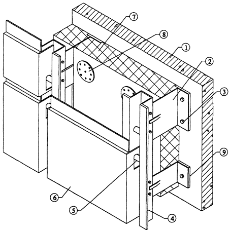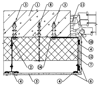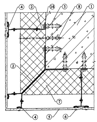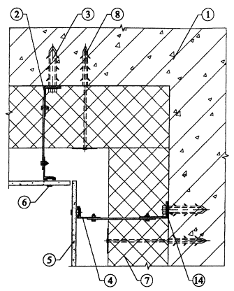 Рис. 3.9. Вертикальный разрез системы. 1. Основание. 2. Кронштейн (составной). 3. Анкерный болт для крепления кронштейна. 4. Вертикальный профиль. 5. Облицовочная плита. 6. Скоба для крепления облицовочной плиты. 7. Утеплитель. 8. Дюбель для крепления утеплителя. 14. Паронитовая прокладка.