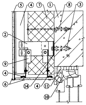 Рис. 3.12. Вертикальный разрез системы у верхнего откоса окна. 1. Основание. 2. Кронштейн (составной). 3. Анкерный болт для крепления кронштейна. 4. Вертикальный профиль. 5. Облицовочная плита. 6. Скоба для крепления облицовочной плиты. 7. Утеплитель. 8. Дюбель для крепления утеплителя. 9. Специальный кронштейн. 10. Оконный блок. 11. Уплотнение. 14. Паронитовая прокладка.