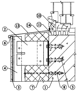 Рис. 3.14. Вертикальный разрез системы у оконного слива. 1. Основание. 2. Кронштейн (составной). 3. Анкерный болт для крепления кронштейна. 4. Вертикальный профиль. 5. Облицовочная плита. 6. Скоба для крепления облицовочной плиты. 7. Утеплитель. 8. Дюбель для крепления утеплителя. 10. Оконный блок. 11. Уплотнение. 13. Слив. 14. Паронитовая прокладка.