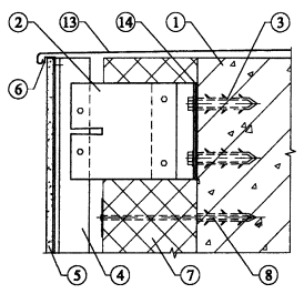 Рис. 3.13. Горизонтальный разрез системы у бокового откоса окна. 1. Основание. 2. Кронштейн (составной). 3. Анкерный болт для крепления кронштейна. 4. Вертикальный профиль. 5. Облицовочная плита. 6. Скоба для крепления облицовочной плиты. 7. Утеплитель. 8. Дюбель для крепления утеплителя. 10. Оконный блок. 11. Уплотнение. 12. Оконный кронштейн. 14. Паронитовая прокладка.