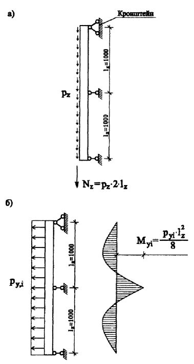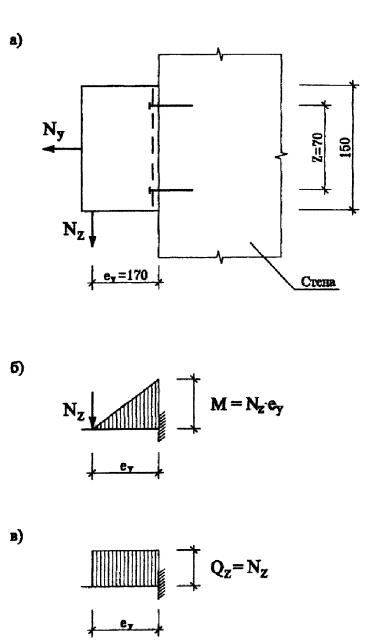 прочность на сдвиг (срез) обеспечивается. 8.4.4. Расчет вспомогательного кронштейнаРасчет производится только на действие горизонтальной ветровой нагрузки. Геометрические характеристики вертикального сечения: hz = 80 мм; t = δ = 3,5 мм; А = hz · δ = 80 · 3 = 240 мм2. Шаги кронштейнов: lх = 0,6 м; lz = 1,0 м. Продольная сила, передаваемая от вертикального профиля Ny = 2Qy,e =2 · 546 = 1092 Н. По формуле (1) [3] на растяжение