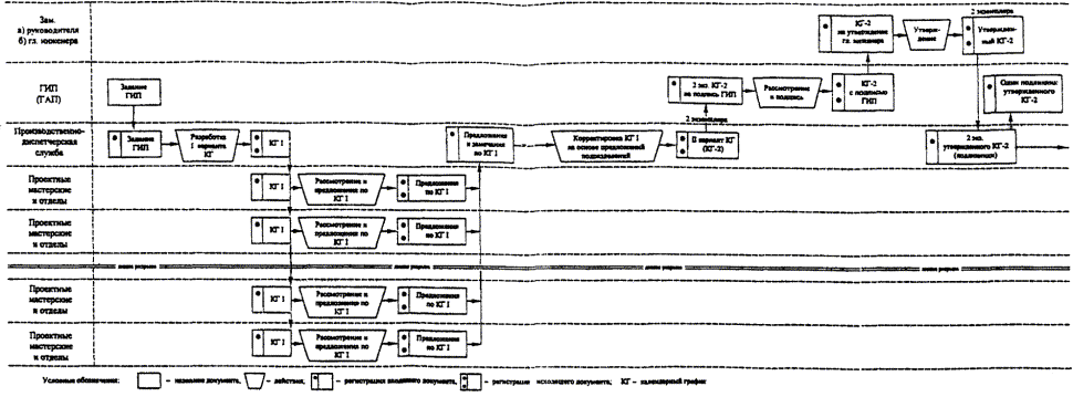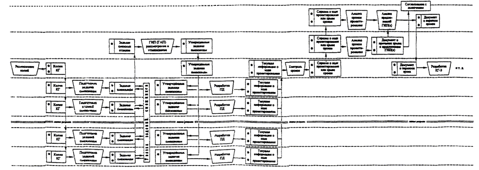 На ОТС приводятся: · последовательность конкретных действий участников и их взаимодействие; · результаты этих действий, зарегистрированные записями. При построении ОТС используются условные обозначения для: · названий документов и их регистрации в соответствующих формах; · действий, выполняемых участниками процедуры; · линии связи отдельных элементов ОТС. Построение ОТС целесообразно выполнять по единообразной схеме: · участники процедуры указываются в левой части схемы; · наименование документов и действия конкретного участника процедуры изображаются в горизонтальной полосе; · последовательность выполнения действий по реализации процедуры указывается в правой части схемы с использованием принятых (описанных выше) обозначений. Разработанная ОТС рассматривается и утверждается руководителем проекта (ГАПом, ГИПом) до описания ДП. 2.6. Ведение записей по качеству. Записи по качеству ведутся для подтверждения соответствия качества ПСД установленным требованиям, для анализа и подтверждения эффективности функционирования СК (для внутреннего и внешнего). По элементу СК 4.4. в состав данных о качестве входят записи о качестве входных проектных данных, о качестве ПСД по результатам анализа, проверок и промежуточного контроля. Для ведения записей о качестве разрабатывается стандартная документация. Регистрация записей о качестве производится путём присвоения им порядкового номера. В целом ведение записей по качеству должно соответствовать требованиям элемента 4.16 ГОСТ Р ИСО 9001-96. 3. Порядок планирования и разработки проектной документации. Методика3.1. Руководство ПИО возглавляет и организует работу по разработке планов проектирования, в т.ч.: а) формирование годовых планов работы ПИО и перспектив его развития (наряду с другими элементами управления) входит в зону ответственности руководителя проектной организации; б) персональную ответственность за организацию работ по выполнению плана ПИР и их качество несёт главный инженер ПИО; в) заместитель руководителя (главного инженера) (в зависимости от структуры ПИО) по производству обеспечивает координацию и контроль объектных графиков выполнения ПИР; г) распоряжением руководства ПИО или архитектурно-проектной мастерской (в зависимости от структуры ПИО) назначается руководитель проекта (ТИП, ГАП), осуществляющий оперативное руководство проектированием конкретного объекта (или отдельного, специализированного вида работ или услуг) в соответствии с требованиями СНиПа 1.06.04-85 «Положение о главном инженере (главном архитекторе) проекта». 3.2. Планирование работ по конкретному объекту осуществляется на этапе организационно-технологической подготовки проектирования специалистами проектных функциональных подразделений под оперативным управлением (при необходимости - с участием) руководителя проекта. План проектирования должен определять все необходимые для осуществления качественного проектирования виды деятельности, устанавливать исполнителей и их ответственность за выполнение работ в рамках ПИО и за её пределами. 3.3. Процедура планирования проектирования конкретного объекта включает: · определение взаимосвязей между различными видами деятельности (разделами проекта); · распределение работ между квалифицированными исполнителями; · установление сроков выполне