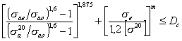 где Nco - число полных циклов нагружения с амплитудами эквивалентных напряжений sae, n - число ступеней амплитуд эквивалентных напряжений sai с числом циклов на каждой ступени равном Nci. Значение параметра sao следует принимать равным 80 МПа для углеродистых и легированных неаустенитных сталей и равным 110 МПа - для аустенитной стали. Примечание: Если число циклов Nc оказывается меньше 1000, то следует принять его равным 1000. 7.4.5. Длительная циклическая прочность высокотемпературного трубопровода на этапе 3б считается обеспеченной, если выполняется условие (7.7) и se ≤ 0,6 [s20], где se - максимальное эквивалентное напряжение на 2 этапе расчета. 7.4.6. Длительная циклическая прочность высокотемпературного трубопровода при se > 0,6 [s20] считается обеспеченной, если выполняется следующее условие суммирования повреждений от усталости и ползучести при установившемся температурном режиме: