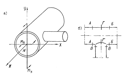 Черт. 7.1. Расчетная схема отвода. Черт. 7.2. Расчетная схема тройникового соединения. а - схема нарушения; б - расчетные сечения. 7.6.2. Приведенные к нормальной температуре эквивалентные напряжения на прямолинейных участках трубопроводов, а также криволинейных с l ≥ 1,0 подсчитываются по формуле (7.12). где коэффициенты gm и βm находятся соответственно по п. 7.6.3.1, знаки Мx и Мy определяются указанными на черт. 7.1 положительными направлениями, коэффициент В вычисляется по формуле: