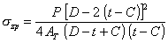 4.2.3. Прибавку С следует определять по формуле: С = С1 + С2 (4.3) где С1 - технологическая прибавка, принимаемая равной минусовому отклонению толщины стенки по стандартам и техническим условиям; С2 - прибавка на коррозию и износ, принимаемая по нормам проектирования или отраслевым нормативным документам с учетом расчетного срока эксплуатации. 4.2.3.1. Для труб-заготовок, используемых для гибки отводов на станках, прибавка С1 равна сумме допусков на минимальную толщину стенки трубы-заготовки и максимальное утонение при гибке. Последняя величина при отсутствии специальных указаний определяется выражением t/(l + 2R/D). 4.2.3.2. Для деталей трубопроводов, получаемых сваркой из труб (секторные отводы, сварные тройники и т.п.) прибавка С1 равна допуску на минимальную толщину стенки трубы-заготовки. 4.2.3.3. Для деталей трубопроводов, изготавливаемых из труб путем горячего и холодного деформирования, прибавка С1 равна допуску на минимальную толщину стенки, указанному в соответствующих данным деталям технических условиях. 5. РАСЧЕТ НА ПРОЧНОСТЬ ТРУБ И ФАСОННЫХ ДЕТАЛЕЙ ПОД ДЕЙСТВИЕМ ВНУТРЕННЕГО ДАВЛЕНИЯ5.1. Трубы5.1.1. Расчетную толщину стенки трубы следует определять по формуле: