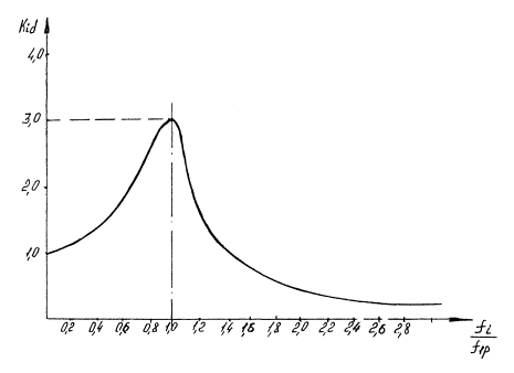 8.1.6.1. Низшую собственную частоту многопролетного трубопровода с пролетами различной длины можно оценивать по наибольшему пролету. Если этот пролет крайний, то дополнительно оценивается собственная частота внутреннего пролета максимальной длины и из двух полученных значений выбирается наименьшее. 8.2. Расчет вынужденных колебаний трубопровода8.2.1. Для количественных оценок сопротивления усталости при вибрациях и амплитуд вибрационных перемещений в характерных сечениях следует проводить расчет вынужденных изгибных колебаний трубопровода. При этом используются данные о динамических нагрузках, полученные в соответствии с разделом 2.2. При отсутствии достоверных данных о характеристиках возбуждающих вибрации нагрузок, расчет вынужденных колебаний следует проводить с использованием результатов специальных испытаний. 8.2.2. Расчет проводится в линейной постановке для детерминированных кинематических и силовых воздействий, заданных в полигармоническом виде. Следует предусмотреть возможность сдвига фаз между нагрузками в различных сечениях трубопровода. Рассматриваются установившиеся колебания системы при рабочих параметрах. Опоры моделируются линейно-упругими связями. Значение коэффициента относительного демпфирования принимается равным 0,02. 8.2.3. Расчет проводится спектральным методом с разложением по формам собственных колебаний трубопровода. Определяются амплитудно-частотные характеристики перемещений в расчетных сечениях, а также вибрационных нагрузок на опоры, подвески и оборудование. 8.2.5. Для приближенной оценки вибрации в трубопроводах с первой собственной частотой до 60 Гц можно воспользоваться методом «динамической жесткости». Согласно этому методу определяется отношение первой собственной частоты f1 и частот возбуждающих нагрузок fip. С помощью этого отношения по черт. 8.1 находится коэффициент динамичности kid. Значения возмущающих нагрузок с i-той частотой умножаются на соответствующий коэффициент динамичности. Далее проводится расчет трубопровода на прочность по формулам этапа 3а. 8.3. Критерии вибропрочности8.3.1. Основным средством обеспечения вибропрочности трубопровода является отстройка собственных частот fi от частот возбуждающих нагрузок fip. При этом должны выполняться условия: