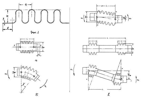 упругих напряжений, определенная по формуле (27), не превышает величины Подобный расчет, а также определение напряженно-деформированного состояния гибких элементов компенсаторов с гофрами других типов, например омегообразными, с учетом геометрической и физической нелинейности, расчет компенсаторов на прочность, определение жесткости, компенсирующей способности и допускаемого числа циклов нагружения могут быть выполнены с помощью программы расчета компенсаторов пакета PVP Design. 1. ГОСТ 27036-86 «Компенсаторы и уплотнения сильфонные металлические. Общие технические условия» - регламентирует размеры и характеристики осевых, сдвиговых и угловых сильфонных компенсаторов без подкрепляющих колец с Dy 65 - 1400 мм на Ру до 6,3 МПа. 2. ТУ 26-02-1122-90 «Компенсаторы сильфонные. Технические требования» - регламентирует размеры и характеристики осевых, сдвиговых и угловых сильфонных компенсаторов с подкрепляющими кольцами и без них с Dy 150 - 400 мм на Ру до 6,3 МПа. 3. ТУ 26-02-876-80 «Компенсаторы линзовые. Технические требования» - регламентирует размеры и характеристики линзовых компенсаторов с Dy 600 - 2000 мм на Ру до 0,63 МПа. Кроме перечисленных выше, при выборе компенсаторов, в зависимости от цели и области применения, могут использоваться также иные отраслевые, заводские, отечественные или зарубежные нормативные материалы, разрешенные к применению в данной области в установленном порядке. 7. Условные обозначения в формулах расчета компенсаторов n - число гофров; q - ширина гофра, мм; с - расчетная прибавка к толщине стенки, мм; С - длина гофрированной части одного сильфона в сдвиговом компенсаторе с вставкой, мм; Cd - безразмерный коэффициент; Cf - безразмерный коэффициент; Ср - безразмерный коэффициент; Cl - осевая жесткость компенсатора, Н/мм; Сg - угловая жесткость компенсатора, Н·мм; Сdy - сдвиговая жесткость компенсатора на действие силы Vy, Н/мм; Сdm - сдвиговая жесткость компенсатора на действие момента My, H·мм/мм; Dв - внутренний диаметр компенсатора, мм; Dн - наружный диаметр компенсатора, мм; Dp - средний диаметр компенсатора, мм; Е - модуль упругости материала компенсатора, МПа; Н - высота гофра, мм; К - безразмерный коэффициент; Ке - коэффициент приведения напряжений; L - длина компенсатора (расстояние между крайними точками гофр компенсатора), мм; l - длина цилиндрической краевой зоны гибкого элемента, мм; Мо - изгибающий момент, действующий на трубопровод при повороте компенсатора на угол, Н·мм; My - изгибающий момент, действующий на трубопровод при сдвиге компенсатора на величину, Н·мм; Р - расчетное давление, МПа; R - распорное усилие, Н; S - номинальная толщина стенки компенсатора, мм; Vy - перерезывающая сила, действующая на трубопровод при сдвиге компенсатора на величину, Н·мм; lp - расчетное осевое перемещение, мм; lnp - приведенное расчетное осевое перемещение, мм; lg - эквивалентное перемещение от угла поворота, мм; ld - эквивалентное перемещение от сдвига, мм; lp - расчетное радиальное перемещение, мм; g - расчетное угловое перемещение, рад; sае - расчетная амплитуда условных упругих напряжений, МПа; se - максимальное эквивалентное напряжение, МПа; scmp - окружные мембранные напряжения от давления, МПа; smbd - осевые изгибные напряжения от перемещения, МПа; smbp - осевые изгибные напряжения от давления, МПа; smmd - осевые мембранные напряжения от перемещения, МПа; smmp - осевые мембранные напряжения 