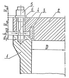 Fш - площадь сечения гладкой части шпильки, мм2; Fоп - площадь плоской прокладки, мм2; b - угол конусности уплотнительных поверхностей (угол между осью вращения детали и образующей уплотнительной поверхности), град; lст - расчетная длина шпильки, мм; Hшб - высота шайбы, мм; Hкр - толщина крышки, мм; hзаз - зазор между торцем крышки и фланцем корпуса сосуда, мм; dоr - радиальный зазор между внутренней поверхностью обтюратора и упором крышки, мм; d2 - средний диаметр резьбы, мм; h - высота плоской прокладки, мм; D - внутренний диаметр сосуда или горловины, мм; D1, D2 - диаметральные размеры плоской прокладки; Dг - диаметр наружной проточки гайки, мм; dшб - диаметр шайбы внутренний, мм; dр - диаметр резьбовой части шпильки, мм; dо - диаметр центрального отверстия в шпильке, мм; Dт - условный диаметр трения торцевой поверхности гайки, мм; P - шаг резьбы шпильки, мм; m - количество шпилек во фланцевом соединении; i - количество одновременно действующих гидродомкратов; n - количество групп шпилек во фланцевом соединении; Z - порядковый номер группы шпилек; Zу - номер группы шпилек, при котором обтюратор изменяет свою податливость; M - количество обходов; N - порядковый номер обхода; Kz1 - коэффициент разгрузки шпилек при однообходном режиме затяжки для соответствующей группы; Kz2 - коэффициент разгрузки шпилек при пообходно-уравнительном режиме затяжки; Kz(M) коэффициент разгрузки шпилек для соответствующей группы (при условии доворачивания гаек крутящим моментом); K1, K2, K3 - коэффициент пропорциональности для перевода величин в единицы систем СИ и (МКС); a - коэффициент относительной податливости уплотнительного кольца (прокладки); aс - коэффициент относительной податливости двухконусного уплотнительного кольца свободного; aу - коэффициент относительной податливости двухконусного уплотнительного кольца прижатого к упору; f1, f2 - коэффициент трения в резьбе и на опорной поверхности гайки; yz - коэффициент. ПРИЛОЖЕНИЕ 3Обязательное УСЛОВНЫЕ ОБОЗНАЧЕНИЯ ОСНОВНЫХ РАЗМЕРОВ ЭЛЕМЕНТОВ ФЛАНЦЕВОГО СОЕДИНЕНИЯ СОСУДОВ И АППАРАТОВ ВЫСОКОГО ДАВЛЕНИЯ