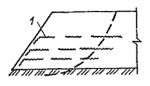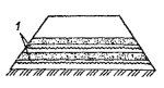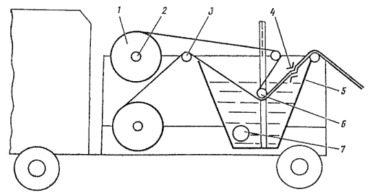 Рис. 7. Схема установки для обработки битумом бумажного материала и его укладки: 1 - рулоны бумаги; 1 - оси рулонов; 3 - ролики; 4 - устройство для регулировки расхода битума; 5 - ванна с битумом; 6 - ролик утапливающий; 7 - подогревающее устройство Укладку выполняют вдоль оси дороги, начиная от обочин, с перекрытием отдельных рядом лежащих полотен на 0,15 - 0,2 м. Работы следует вести в сухую погоду при температуре воздуха не менее 5 °С и силе ветра не более 6 м/с. Отсыпка на прослойку материала вышележащего слоя ведется по способу «от себя» без заезда построечного транспорта на открытую поверхность. Разравнивание материала выполняют не менее чем за три хода, чтобы предотвратить скольжение его по бумаге, что может вызвать её разрыв. В течение смены весь уложенный материал должен быть перекрыт вышележащим слоем. СОДЕРЖАНИЕ