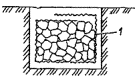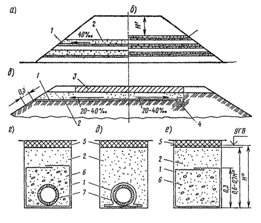 где Рис. 16. Графики к расчету по п. 5.2 (определение коэффициента b) Рис. 17. График к подбору обратного фильтра (п. 5.2): 1 - кривая распределения пористости СМ с r=600 г/м2; 2 - то же с r=300 г/м2 Следует считать возможным применение СМ как фильтра, если кривая распределения зерного состава грунта пересекает горизонталь, соответствующую 15% содержания частиц, правее точки а (рис. 17). 5.3. Особенности технологии производства работ5.3.1. Устройство из CM защитных прослоек и прослоек для улучшения условий дренирования (см. рис. 12, а, б, в) выполняют в соответствии с пп. 3.3.1 - 3.3.6. Укладку полотен ведут, начиная от бровки земляного полотна к центру с перекрытием их краев на 0,2 м и учетом запаса для выпуска на откосную часть. Соединение полотен выполняют анкерами или скобами в месте их перекрытия через 6 - 8 м по длине полотна. Если отвод воды предусмотрен по прослойке СМ непосредственно в дрену (см. рис. 12, в) или подкюветный дренаж, СМ укладывают с выпуском, достаточным для охвата дрены или контура траншеи. Рис. 18. Порядок выполнения работ при устройстве траншейного дренажа: 1 - траншея; 2 - СМ; 3 - анкеры; 4 - щебень; 5 - песок; 6 - глиняный экран; 7 - трубчатая дрена 5.3.2. При устройстве конструкции по рис. 12, г, е полотна укладывают вдоль траншеи, один край закрепляют на поверхности грунта анкерами, устанавливаемыми через 3 - 4 м вдоль траншеи. После этого СМ опускают в траншею, разравнивают и закрепляют второй его конец. Такое решение применяют, если ширина полотна (с учетом перекрытия концевых частей на 0,3 м) не менее периметра дренажной засыпки. В противном случае полотна СМ нарезают отдельными кусками длиной, равной периметру дренажной засыпки, и укладывают поперек траншеи с взаимным перекрытием кусков 0,2 м. 5.3.3. Дренирующий материал засыпают по оси траншеи после разравнивания, закрепления СМ и укладки дрены (если она предусмотрена проектом). Засыпку разравнивают и послойно уплотняют, обеспечивая целостность СМ и уложенной дрены. Края полотен освобождают от анкеров, заворачивают на поверхность уложенного дренирующего материала и создают слой водонепроницаемого экрана. Схематически порядок выполнения работ приведен на рис. 18, а. 5.3.4. При устройстве конструкций по рис. 12, д на дно траншеи укладывают предварительно подготовленную полосу СМ требуемой ширины, укладывают на нее дрену и покрывают дрену второй полосой СМ. Полосы с двух сторон от дрены прижимают к дну траншеи анкерами, устанавливаемыми через 4 - 5 м вдоль траншеи. Схематически порядок выполнения работ приведен на рис. 18, б. В сложных грунтовых условиях применяют комбинированное решение, когда конструкцию по типу рис. 18, б помещают в траншею, закрытую СМ по типу рис. 18, а. 6. ТЕХНИКА БЕЗОПАСНОСТИ ПРИ ПРИМЕНЕНИИ СИНТЕТИЧЕСКИХ МАТЕРИАЛОВ6.1. К работе с применением рулонных синтетических материалов допускаются лица, прошедшие обучение и инструктаж по безопасности труда в соответствии с ГОСТ 12.0.004-79 и знающие безопасные методы и приемы труда. 6.2. Работающие с вредными веществами должны быть проинструктированы об их свойствах и о мерах по оказанию первой помощи при поражении ими. Лица, допускаемые к эксплуатации дорожно-строительных машин, должны иметь удостоверения на право работы на них. 6.3. Лица, допускаемые к эксплуатации установок для соединения полотен СМ с использованием газового топлива, должны пройти обучение и получ