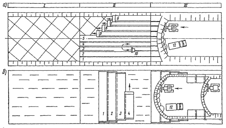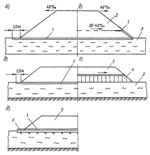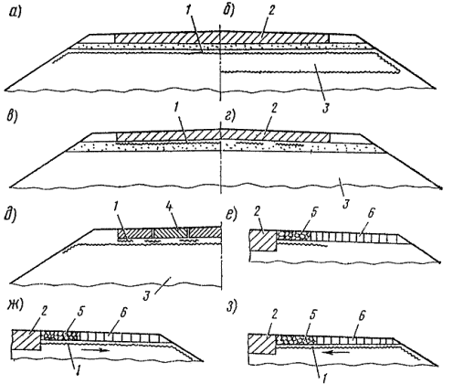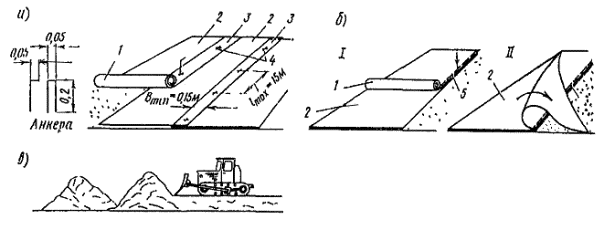 где lп - размер пустот (щелей), перекрываемых СМ, см; Р - давление песчаной засыпки на прослойку, МПа. 3.3. Особенности технологии производства работ3.3.1. При устройстве прослоек из СМ в применяемые технологии дополнительно вводятся операции: подготовка подстилающего прослойку грунта; транспортировка, распределение по участку рулонов СМ, их укладка и при необходимости соединение; Отсыпка на СМ материала вышележащего слоя, его распределение и уплощение. Общая технологическая схема устройства прослоек из СМ приведена на рис. 5. 3.3.2. Подготовка подстилающего СМ грунта состоит в профилировании его поверхности и уплотнении. Коэффициент уплотнения грунта должен соответствовать нормативным требованиям, поверхность не должна иметь колеи, ям и других неровностей глубиной более 5 см. Рис. 5. Общая технологическая схема устройства прослоек из СМ: а - продольная укладка СМ; б - поперечная укладка СМ, 1 - 9 - рулоны (полотна) СМ; 10 - установка для соединения СМ, 11 - бульдозер; 11 - автомобиль-самосвал Рис. 6. Способы укладки CM (а, б) и отсыпка на поверхность СМ материала, лежащего выше слоя (в): 1 - рулоны СМ; 2 - уложенные полотна СМ; 3 - зона перекрытия, 4 - анкеры, 5 - место соединения полотен При устройстве прослойки из CM в основании насыпи, сложенном слабыми грунтами, подготовка может не выполняться, если отсутствует опасность повреждения СМ. При наличии глубокой колеи или ям их засыпают грунтом, планируют автогрейдером или бульдозером. Кустарник, деревья вырубают и спиливают на одном уровне с поверхностью. В этом случае корчевка пней может не проводиться. Если в момент производства работ на участке имеются поверхностные воды, то отсыпают защитный слой из местного грунта толщиной 20 - 30 см, но не менее чем на глубину подтопления. 3.3.3. Рулоны CM транспортируют к месту производства работ непосредственно перед укладкой и распределяют по длине участка работ через расстояние, соответствующее длине полотна в рулоне. 3.3.4. Укладку полотен выполняют, как правило, вдоль земляного полотна путем раскатки рулонов вручную звеном из трех дорожных рабочих. После раскатки первых метров краевую часть (по ширине) полотна прижимают к грунту двумя-тремя анкерами (стержни диаметром 3 - 5 мм) длиной 15 - 20 см с отогнутым верхним и заостренным нижним концами. При дальнейшей раскатке производят периодическое разравнивание полотна с небольшим продольным его натяжением и креплением к грунту анкерами (или другим способом) через 10 - 15 м (через 1,5 - 2,0 м при устройстве прослойки из CM на слабом основании). Крепление выполняют во избежание смещения полотна при действии ветровой нагрузки, укладке вышележащего слоя, а также для сохранения небольшого предварительного натяжения СМ. Полотна укладывают с перекрытием не менее 0,15 м (рис. 6, а) и при необходимости дополнительно соединяют. При устройстве прослойки из СМ в основании насыпи, сложенном слабыми грунтами, величину перекрытия назначают в соответствии с п. 3.1.11, но не менее 0,3 м. Укладку полотен в поперечном направлении выполняют, если необходимо обеспечить равнопрочность полотна по ширине насыпи (устройство прослойки с целью обеспечения устойчивости слабого основания и откосов насыпи) и невозможно обеспечить надежное соединение отдельных полотен. Величина перекрытия полотен в этом случае должна быть не менее 0,2 - 0,3 м; полотна крепят к грунту ан