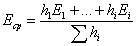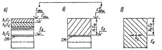 где 0,01 - коэффициент приведения размерностей; f - коэффициент, зависящий от методики определения Есм (f = 2 - для методики приложения 1А, f = 1 - для методики приложения 1Б и других методик, предусматривающих проведение испытаний в условиях сложного напряженного состояния); Есм - условный модуль упругости СМ, принимаемый по результатам испытаний или приложению 5, Н/см; d - толщина синтетического материала, см; Е0 - модуль упругости на поверхности лежащих под СМ грунтовых слоев (см. п. 3.2.4), МПа. 3.2.3. Если 150£Есм<350 Н/см и прослойку из СМ укладывают на контакте «крупнофракционный материал (щебень, гравий) - грунт», модуль упругости на поверхности грунта без расчета повышают в 1,2 раза. Корректировку толщин в этом случае не выполняют, а конечный эффект от применения СМ выражают в увеличении межремонтных сроков службы (п. 7.6). 3.2.4. Корректировку толщин проводят следующим образом: приводят к двухслойной назначенную согласно ВСН 46-83 конструкцию дорожной одежды (рис. 3, а), границей между слоями которой является прослойка СМ (рис. 3, б). Верхний слой имеет параметры (обозначения по рис. 3):