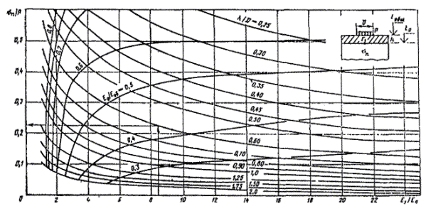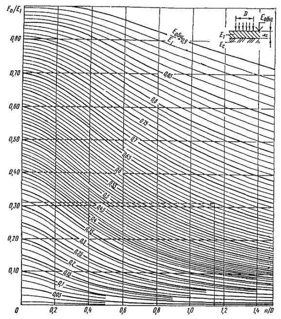 Рис. 3. Схемы к расчету по п. 3.2 Рис. 4. Номограмма к расчету по п. 3.2 Нижний слой имеет модуль упругости Е0, равный модулю упругости на поверхности лежащих под СМ грунтовых слоев. Значение Е0 находят по номограмме (рис. 4). При укладке СМ непосредственно на поверхность земляного полотна Е0 равен модулю упругости грунта земляного полотна; определяют общий модуль упругости на поверхности покрытия дорожной одежды: Еаобщ = Еобщ/a1(2) где a1(2) - коэффициент усиления, принимаемый по табл. 3 приложения 2 при известных значениях Еср, Н, Есм, Е0, D (D = 37 см); уменьшают толщину одного из слоев дорожной одежды до соблюдения условия Еаобщ = Етр, так как Еаобщ > Еобщ ³ Етр. Для этого исходя из нового значения модуля упругости на поверхности покрытия Еаобщ последовательно сверху вниз с использованием номограммы (см. рис. 4) определяют значения модулей упругости на поверхности каждого слоя дорожной одежды вплоть до слоя, толщину которого предполагается уменьшить. По той же номограмме находят его условную толщину h¢i при найденном новом (увеличенном) значении модуля упругости на поверхности этого слоя и скорректированное значение этой толщины hia из выражения Последовательность расчета показана в приложении 3А. где sа, Rрасч - соответственно
