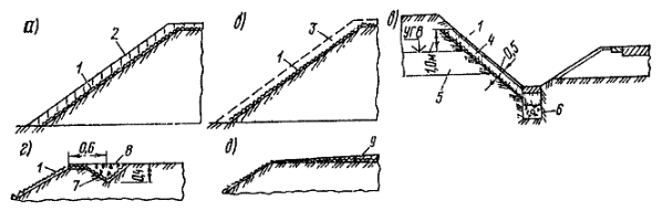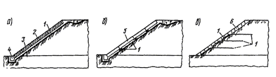 Значения длины заделки материала lз (см. рис. 10, а, б) должны быть не менее 2 м. 4.3. Особенности технологии производства работ4.3.1. Основные технологические процессы по устройству различных конструкций укрепления с применением СМ назначаются в соответствии с действующими нормативно-техническими документами. Дополнительно выполняются лишь операции по укладке полотен СМ. 4.3.2. Операции по укладке СМ включают: подготовку (при необходимости) траншеи вдоль бровки земляного полотна для закрепления прослойки в верхней его части (см. рис. 8, г); транспортировку рулонов к месту строительства, их разгрузку и распределение вдоль откоса, подготовку рулонов к укладке; укладку СМ; закрепление полотен в верхней и (при необходимости) нижней частях откоса. 4.3.4. Рулоны транспортируют и распределяют вдоль бровки через определенное расстояние, зависящее от длины материала в рулоне, длины образующей откоса, направления раскатки рулонов. 4.3.5. Укладку полотен СМ выполняют путем продольной или поперечной раскатки рулонов по поверхности откоса. Характер раскатки определяется конкретными условиями строительства. Продольная раскатка рулонов технологически предпочтительна для относительно пологих откосов с заложением 1:2 и выше. Поперечная раскатка рулонов обеспечивает лучшие условия для закрепления создаваемой прослойки в верхней и нижней частях насыпи и большую сопротивляемость ее возникающим сдвигающим усилиям. Такая раскатка предпочтительна для укрепления откосов насыпей значительной высоты и обязательна для повышения их общей устойчивости. Продольную раскатку рулонов выполняют вручную полосами, начиная с нижней части насыпи с взаимным перекрытием не менее 0,2 м. В процессе раскатки полотна периодически через 10 - 15 м разравнивают и прижимают к поверхности откоса анкерами или скобами. Анкеры и скобы устанавливают в 2-3 точках по ширине рулона через 5 - 6 м по его длине. Поперечную раскатку выполняют от бровки насыпи. Для этого предварительно край полотна закрепляют анкерами или скобами на поверхности насыпи, после чего рулон постепенно опускают к подошве насыпи, обрезают, полотна разравнивают с легким натяжением за нижний конец и закрепляют через 4 - 5 м анкерами или скобами. Рулон поднимают на поверхность откоса и повторяют операцию. Соседние полотна должны иметь перекрытие не менее 0,1 - 0,15 м. Перемещение рулона в нижнее положение с одновременной раскаткой и обратно можно выполнять вручную с помощью установки в центр рулона тонкой трубки или стержня и веревки. 4.3.6. Если предусмотрено дополнительное закрепление СМ у подошвы, например под упором (см, рис. 9, а, б), и в верхней части, например в траншее (п. 4.3.3), дополнительно по местам перелома траншей выполняют прижатие полотен к грунту анкерами. Траншею в верхней части насыпи после укладки СМ заполняют песчано-гравийной смесью, щебнем, местным грунтом и уплотняют. При устройстве конструкций укрепления откосов по п. 4.1.6, предусматривающих заглубление СМ в тело земляного полотна, укладку полотен СМ выполняют в процессе послойного возведения земляного полотна. При этом рулоны раскатывают в продольном направлении, если ширина полотен достаточна с точки зрения их заделки в грунт или есть возможность обеспечить равнопрочность швов при соединении отдельных полотен. В остальных случаях рулона СМ раска