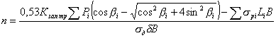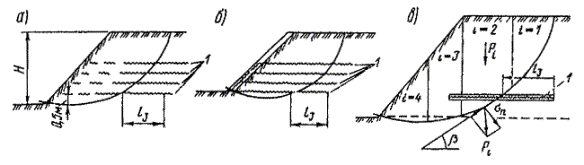 где spi - предельное значение растягивающих напряжений для грунта (п. 4.2.3); n, d - количество прослоек СМ, их толщина; Pi = giFiB - вес каждого из блоков, на которые разбивается откос над поверхностью скольжения (положение линии скольжения определяется любым известным методом, например с использованием графика Ямбу - рис. 11); Fi, В, gi, Li - соответственно площадь, толщина, удельный вес блоков и длина поверхности скольжения в их пределах (как правило, В=1); sд - расчетное значение допустимого растягивающего напряжения для СМ (п. 4.2.4); bi - угол наклона поверхности скольжения к горизонту в пределах блока. Схема к расчету приведена на рис. 10, в. 4.2.3. Для точного определения предельного значения растягивающих напряжений для грунта spi по стандартной методике ГОСТ 12248-78 проводят испытания грунта на сдвиг при значении нормального давления sn соответствующего нормальному давлению на поверхности скольжения в данном блоке i, после чего spi рассчитывают по формуле