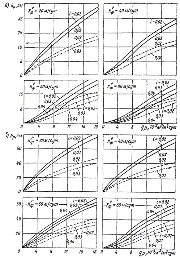 Примечание. Кw - коэффициент переувлажнения грунтов земляного полотна (отношение фактической влажности к оптимальной). 5.1.4. Если отдельные полотна СМ укладывают поперек земляного полотна или при продольной укладке предусмотрено соединение полотен сшиванием, возможно одновременно решить задачу повышения общей устойчивости откосов (см. п. 4.2). 5.1.5. Прослойки из СМ в сочетании с песчаным дренирующим слоем дорожной одежды (см. рис. 12, в) устраивают из нетканых упрочненных иглопробиванием СМ, отвечающих требованиям табл. 2.2 и имеющих толщину не менее 3,5 мм и вес не менее 300 г/м2. Рекомендуемое начальное значение коэффициента фильтрации СМ в плоскости полотна при обжатии нагрузкой 0,01 МПа составляет 140 м/сут, но не менее 100 м/сут. Если предусмотрен сброс воды по прослойке из СМ непосредственно в продольный трубчатый дренаж, отношение коэффициента фильтрации СМ в нормальном плоскости полотна направлении к коэффициенту фильтрации грунта должно быть больше 2 при дренировании песчаных грунтов, больше или равно 10 при дренировании глинистых грунтов. Расчет дренирующих слоев с прослойками СМ выполняют согласно п. 5.2. 5.1.6. Прослойки из СМ по п. 5.1.5 укладывают непосредственно на земляное полотно под песчаный дренирующий слой по всей ширине последнего (см. рис. 12, б), их края должны быть выведены на откосную часть не менее чем на 0,5 м. В этом случае обеспечивается эффективное функционирование дренирующего слоя, создаваемого в том числе из песков средней крупности и мелких с низким коэффициентом фильтрации (1 - 3 м/сут). 5.1.7. Если грунты земляного полотна содержат более 50% частиц размером 0,005 - 0,05 мм и менее 25% частиц крупнее 0,1 мм по массе, на контакте «CM-земляное полотно» следует предусматривать устройство технологического песчаного слоя минимальной толщины. 5.1.8. При устройстве траншейных дренажей, дренажей с трубчатыми дренами СМ используют в качестве дренирующего и защитного элемента (фильтра), обеспечивающего долговременное функционирование дренажа взамен устройства трудоемких фильтровых обсыпок. В этом случае СМ должны отвечать требованиям табл. 2.2, а возможность их применения должна быть проверена по методике, изложенной в п. 5.2. 5.2. Методика расчета5.2.1. Расчет песчаного дренирующего слоя дорожной одежды в сочетании с прослойкой из СМ и проверка возможности применения СМ в качестве фильтра изложены соответственно в пп. 5.2.2, 5.2.4 и 5.2.5. После назначения толщины дренирующего слоя по п. 5.2.2 проводят перерасчет дорожной конструкции с введением поправки на расчетную влажность грунтов земляного полотна согласно табл. 8 приложения 2. 5.2.2. Назначение толщины песчаного дренирующего слоя с прослойкой из СМ выполняют исходя из условия временного размещения в нем воды (ВСН 46-83) и своевременного ее отвода. Расчет песчаного дренирующего слоя с прослойкой из СМ из условия своевременного отвода воды выполняют в следующем порядке (приложение 3Б): определяют расчетное значение коэффициента фильтрации СМ в плоскости полотна Крф (п. 5.2.3); определяют расчетное значение притока воды в дренирующий слой qр по формуле где q - среднесуточный приток воды в основание дорожной одежды; Кп - коэффициент «пик», назначаемые по табл. 18, 19 ВСН 46-83; определяют по номограмме (рис. 13, а, б) расчетную глубину фильтрационного потока hр в зависимости от длины пути фильтрации lф, коэффициентов 
