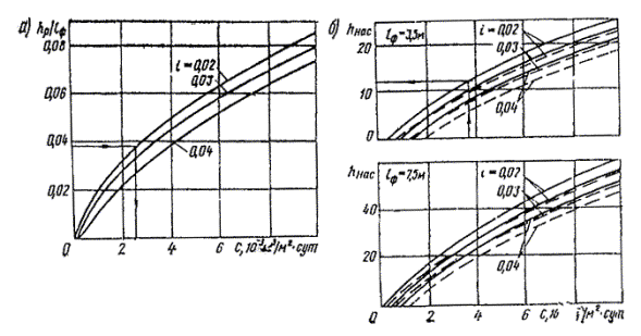 Значение Рис. 13. Номограмма к расчету по п. 5.2 (определение hp): а - при lф = 3,5 м; б - при lф = 7,0 м; Рис. 14. Номограмма к расчету дренирующего слоя по п. 5.2 (определение hнас и С):