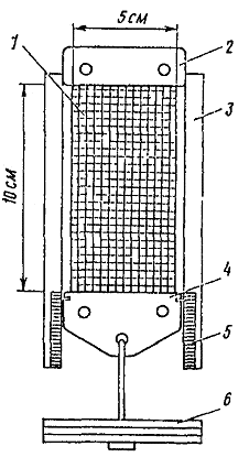 где 7.7. Годовой экономический эффект от применения СМ Э = (Зб - Зв)А, (7.5) где Зв, Зб - приведенные затраты по внедряемому и базовому вариантам; А - годовой объем работ. 7.8. Форму и порядок расчета экономического эффекта назначают в зависимости от области применения СМ с учетом также формы и порядка примера расчета, приведенного в приложении 4. ПРИЛОЖЕНИЕ 1МЕТОДЫ ИСПЫТАНИЙ РУЛОННЫХ СИНТЕТИЧЕСКИХ МАТЕРИАЛОВА. Определение механических характеристик СМ в условиях одноосного растяжения (упрощенная методика). Механические характеристики СМ определяют растяжением образца СМ прямоугольной формы размером 5´20 см (рис. 1). Испытуемый образец закрепляют в двух зажимах, один из которых установлен неподвижно, а через второй ступенями прикладывают нагрузку. Расстояние между зажимами (длина деформируемой части образца) 10 см. По боковым граням подвижного зажима установлены направляющие, служащие для предотвращения его перекоса в процессе испытаний. Направляющая снабжена шкалой, по которой замеряют перемещения зажима после каждой ступени нагружения и разгрузки (общая и остаточная деформации). При небольших перемещениях (3 - 5 мм при нагрузках 25 - 30 Н/см) необходимо применять более точную аппаратуру, например прогибомеры типа ПМ-130 с ценой деления не менее 0,1 мм. Общее число ступеней нагружения принимается равным 8 - 10, причем 4 - 5 из них должны приходиться на диапазон нагрузок до 25 - 30 Н/см, а первую из них назначают равной 3 Н/см. Время выдержки на каждой ступени 15 с. Для оценки надежности закрепления вдоль кромок подвижного и неподвижного зажимов на СМ любым красителем наносят полосы. При правильном закреплении полосы не должны отходить от зажима, а разрыв образца происходит в средней его части. Испытывают не менее 6 образцов: 3 в продольном и 3 в поперечном направлениях по отношению к направлению раскатки рулона. Рис. 1. Схема испытаний СМ по методу одноосного растяжения (упрощенный вариант): 1 - образец СМ; 2, 4 - верхний неподвижный и нижний подвижный зажимы; 3 - направляющие полосы; 5 - шкала; 6 - грузы Механические характеристики CM (п. 2.2.5) определяют из следующих выражений:
