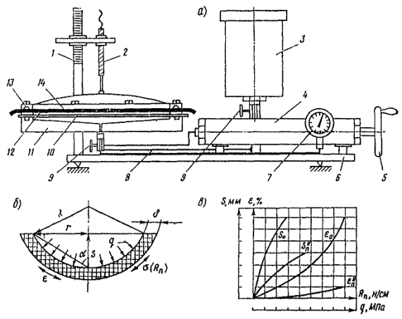 где R¢, Dl - общая нагрузка, Н, и перемещение зажима, см, при разрыве образца; e¢ и e¢y - общая и упругая относительные деформации при нагрузке R1 = 25 - 30 Н/см (вычисляют аналогично e0); Dlп - перемещение зажима на первой ступени нагружения, см; l0 и b - соответственно длина и ширина образца, см. Б. Определение механических характеристик СМ в условиях сложного напряженного состояния методом сферического растяжения. Испытания СМ по методу сферического растяжения заключаются в нагружении жидкостью (маслом) защемленного по контуру круглого образца СМ диаметром 12 см (рис. 2, а) через резиновую предварительно оттарированную мембрану. Для оценки механических свойств СМ, как правило, достаточно 5 образцов. Испытания проводятся путем приложения к образцу ступенчатой нагрузки (5 - 6 ступеней) с разгрузкой на каждой ступени. Выдержка нагрузки на каждой ступени 15 с. Рис. 2. Схема прибора для оценки механических свойств СМ по методу сферического растяжения (а), расчетная схема (б) и графики результирующих зависимостей (в) по этому методу: 1 - штатив; 2 - датчик замера перемещений; 3 - камера с маслом; 4, 5 - рукоятка и рабочая камера насоса; 6 - станина; 7 - манометр; 8 - трубопроводы для подачи масла; 9 - регулировочные краны; 10 - мембрана; 11 - нижняя рабочая камера; 12, 13 - нижняя и верхняя кольцевые накладки для закрепления образца; 14 - образец СМ Величину прогиба мембраны Sп замеряют на каждой ступени приложения нагрузки. Определение восстанавливающей части прогиба мембраны Sy осуществляют также на каждой ступени при разгрузке образца. Общую относительную деформацию и растягивающее усилие Rn (рис. 2, б, в) рассчитывают на каждой ступени нагружения по формулам: