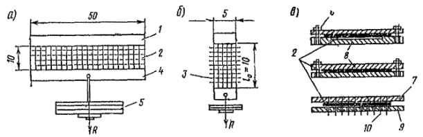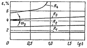 где q - удельное давление жидкости на испытываемый образец, МПа; r - радиус испытываемого образца, см. Величину восстанавливающейся части относительной деформации рассчитывают по формуле (4), но при значении Sп = Syп (Syп - величина восстанавливающейся части общего прогиба мембраны). Значения условных модулей упругости и деформации СМ рассчитывают по формуле (2). В. Определение механических характеристик СМ по методу длительного растяжения. Испытания состоят в замере через определенные промежутки времени деформаций образцов, к которым приложены длительно действующие постоянные нагрузки R. Испытаниям подвергают образцы прямоугольной формы шириной 50 и длиной 20 см при длине свободно растягиваемой части l0 = 10 см (рис. 3, а). Для примерной предварительной оценки допустимо уменьшение ширины образцов до стандартной - 5 см (приложение 1А), но с дополнительной установкой накладок, препятствующих их сужению (рис, 3, б). Конструкцию накладок назначают в зависимости от вида СМ таким образом, чтобы его структура не нарушалась На рис. 3, в представлены различные варианты накладок. Испытания выполняют в следующем порядке: проводят предварительные испытания трех образцов СМ по методике приложения 1А, при времени выдержки на каждой из ступеней нагружения 10 мин. По их результатам назначают нагрузку R для основных испытаний. При этом если деформации e=5% (без учета начальной - см. приложение 1А) достигается до разрыва образцов значения R в основных испытаниях принимают равными 30, 50, 70, 90% от R5 (где R5 - нагрузка при e=5%). В противном случае значения принимают в долях нагрузки при разрыве Rp: для полиамидных, полиэфирных тканых и нетканых (исключая нетканые из коротких волокон при химическом способе упрочнения полотна) - 30, 45, 60, 75% от Rp; для полипропиленовых - 5, 10, 15, 20% от Rp; для остальных при отсутствии данных о свойствах - 20, 30, 40, 50, 60, 70% от Rp; Рис. 3. Схемы испытаний по методу длительного растяжения: 1, 4 - зажимы; 2 - СМ; 3 - накладки; 5 - грузы; 6 - стяжки; 7, 8 - верхняя и нижняя накладки; 9 - накладка с отверстием под шины; 10 - шины к образцам основных испытаний (см. рис. 3, а, б) прикладывают начальную нагрузку Rн=3 Н/см и через tн=10 мин замеряют величину удлинения образца Dlн с помощью прогибомеров ПМ-130 или других устройств с точностью отсчета не ниже 0,1 мм; нагрузку Rн дополняют для каждого из образцов до одной из нагрузок R, ранее принятых по результатам предварительных испытаний. Через определенные промежутки времени проводят замер удлинений образцов Dl. Время замеров назначают равным 1, 2, 4, 6, 24, 48 ч. Время последующих замеров назначают в зависимости от хода деформирования образцов. Если значения R5£0,3Rр для полиамидных и полиэфирных, R5£0,05Rр для полипропиленовых и R5£0,2Rр для других видов материалов, а удлинение за последние 24 ч меньше 10% удлинения за первые 24 ч, испытания прекращают. В других случаях испытания проводят до достижения удлинения Dl = (0,1l0+Dlн) или до начала роста скорости деформирования образца, но не более 60 сут, время между замерами 24 ч (для примерной оценки можно ограничиться временем испытаний 48 ч). Обработку данных выполняют в следующем порядке: по результатам испытаний строят график зависимости относительных деформаций образца (e, %) от времени наблюдений (lgt, ч) для каждого из значений постоянно действующих нагрузок R (рис. 4), где e = 100 (Dl - Dlн)/ l0; вычисляют значения конечных деформаци
