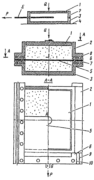 Примечания. 1. В таблице приведены показатели CM на момент их производства. 2. Показатели, отмеченные знаком *, представляют собой наиболее приемлемые значения и строго не нормируются; знак (-) обозначает, что показатель не нормируется. 3. Пункты Указаний, на которые сделана ссылка в графе 2, содержат дополнительные требования к СМ для данной области применения и функционального назначения. 4. При необходимости выполнении СМ нескольких из перечисленных в графе 2 функций следует руководствоваться максимальными значениями показателей. 5. Значения показателей по графам 3 - 6 даны для испытаний СМ по методике одноосного растяжения (см. п. 2.3.1, приложение 1А). Их отклонение в меньшую сторону у анизотропных СМ допускается только для случая применения последних при армировании откосов и в направлении, нормальном действию растягивающих напряжений. 2.3. Методы контроля (испытаний) синтетических материалов2.3.1. Механические характеристики СМ (Rр, Ед(см), Есм, eо - см. п. 2.2.5) являются основными показателями, от которых зависит возможность, а также эффективность их применения. Они определяются предприятиями-изготовителями по ГОСТ 15902.3-79 путем одноосного растяжения образцов размерами 50´200 мм (100 мм - деформируемая часть). Упрощенный вариант данного метода, более доступный производственным подразделениям, изложен в приложении 1А. Поскольку условия деформирования образцов в данных испытаниях не соответствуют в ряде случаев условиям деформирования СМ в дорожной конструкции, полученные результаты применимы прежде всего для сопоставления СМ различных видов, предварительного их выбора и примерной оценки области применения. Такие испытания также применимы для оценки характеристик СМ, если последние не воспринимают значительных усилий в дорожной конструкции (фильтры дренажных устройств, обратные фильтры, защитные прослойки для повышения местной устойчивости откосов). В других же случаях они должны быть дополнены испытаниями, отражающими особенности работы прослоек из СМ в реальных условиях, а именно: при усилении верхней части дорожных конструкций, обочин, армировании слабых оснований насыпей - методом сферического растяжения по приложению 1Б (возможно применение других аналогичных методов, предусматривающих испытание СМ в условиях сложного напряженного состояния); при армировании откосов с целью повышения их общей устойчивости - методом длительного растяжения по приложению 1В. 2.3.2. В случае возможности возникновения в отдельных точках СМ значительных локальных усилий (укладка СМ на контакте с крупнофракционными материалами, например под слой гравийного или щебеночного основания дорожной одежды) должна быть оценена сопротивляемость СМ местным повреждениям в соответствии с приложением 1Г. 2.3.3. Водопроницаемость CM, выполняющих функции дренирующих прослоек, оценивают по значениям коэффициентов фильтрации в плоскости полотна и нормальном ей направлении. В первом случае испытания проводят, пропуская воду порциями 30 см3 вдоль блока из 2 - 4 образцов CM, обжатых давлением не менее 0,01 МПа, и фиксируют время истечения. Во втором испытания проводят по методике, принятой для песка, заменяя его на блок из 20 - 30; образцов СМ. Коэффициенты фильтрации Кф определяют по формуле