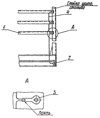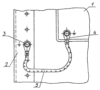 1 - каркас; 2 - опорная рама; 3 - шина заземления; 4 - зажим заземления Черт. 4 1.4.5. Электрическое соединение между поворотной рамой и каркасом щита, а также двери малогабаритного щита и столешницы культа с их каркасами должно быть выполнено гибким проводником на основании рабочих чертежей конструкторской документации. 1.4.8. Электрическое соединение дверей шкафных щитов, пультов и панелей ПнВ-Д с их каркасами обеспечивается через металлические петли. 1.4.7. Электрическое соединение вспомогательных элементов ВУ, ВУ-Д, ПнД, ПнТД с каркасами рядом стоящих щитов, а также ПнД, ПнТД с каркасами щитов, на которых они установлены, должно обеспечиваться аналогично описанному в п. 1.4.2. 1.4.8. Электрическое соединение между металлическими деталями для монтажа аппаратов и проводок по п. 1.2.2 и каркасом щита, в зависимости от вида покрытия частей каркаса щита, а также принятой на предприятии-изготовителе технологии, выполняют одним из способов, приведенных в п.п. 1.4.8.1, 1.4.8.2. 1) гибким неразрезанным проводником, присоединяемым ко всем установленным основным металлическим деталям для монтажа аппаратов и проводок, в местах их крепления к каркасу и к заземляющему зажиму щита (черт. 5). Указанный проводник должен быть предусмотрен в рабочей документации; 2) зубчатой шайбой, установленной на винт, крепящий металлические детали к стойкам каркаса щита. При этом зубчатая шайба устанавливается так, чтобы её зубья разрубали лакокрасочное покрытие на стойке щита (черт. 6). Пример электрического соединения угольников и скоб в щите, стативе, пульте 1 - угольник У (скоба С); 2 - заземляющий зажим М6; 3 - кабельный наконечник; 4 - гибкий неразрезанный проводник Черт. 5 Пример электрического соединения угольников и скоб в щите, стативе, пульте с помощью зубчатой шайбы 1 - угольник У; 2 - болт; 3 - шайба; 4 - шайба пружинная; 5 - шайба зубчатая; 6 - гайка Черт. 6 1.4.9. Зануление (заземление) корпусов устройств, имеющих специальные выводы "земля", выполняют гибким нулевым защитным проводником, который должен быть предусмотрен в рабочей документации нулевой защитный проводник от вывода "земля" следует присоединять к заземляющему зажиму щита, либо к заземляющему зажиму специально организованному на стойке каркаса щита. 1.4.9.1. Соединение выводов "земля" устройств с заземляющим зажимом щита выполняют гибким неразрезанным нулевым защитным проводником, на котором смонтировано необходимое количество кабельных наконечников. Последние монтируют на расстояниях, соответствующих расположению зануляемых устройств и позволяющих выполнить присоединение без натяга проводника (черт. 7). Пример выполнения зануления (заземления) приборов и аппаратов, имеющих специальный вывод "земля" 1 - прибор; 2 - заземляющий зажим М6; 3 - кабельный наконечник; 4 - нулевой защитный проводник Черт. 7 1.4.9.2. Для присоединения нулевого защитного проводника к стойке каркаса щита поверхность у монтажного отверстия в стойке, предназначенного для установки заземляющего зажима, должна быть зачищена от лакокрасочного покрытия. Место зачистки должно быть защищено противокоррозионной смазкой по п. 1.4.2. 1.4.9.3. В монтажное отверстие в стойке каркаса щита, поверхность вокруг которого подготовлена по п. 1.4.9.2 должен быть установлен и обозначен заземляющий зажим по ГОСТ 21130-75. 1.4.9.4. Стойка каркаса щита, на которой организованы один или несколько 