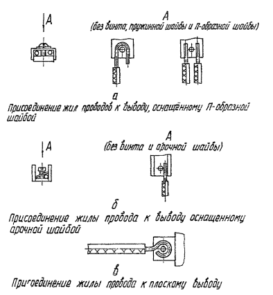 При оконцевании жилы кабельным наконечником под пайку производят снятие изоляции на длину 7 мм для однопроволочных жил и на 12 мм для многопроволочных, а при оконцевании наконечником под опрессовку - на длину 7 мм. При снятии изоляции механическим инструментом не допускается надрез жилы или её отдельных проволок. При снятии изоляции электрическим инструментом длина местного потемнения или оплавления у торца изоляции не должна превышать 1 мм, а для проводов с площадью сечения более 0,75 мм2 - 2 мм. 2.1.3.3. После снятия изоляции жилы зачищают. Зачистку жил рекомендуется производить шлифовальной шкуркой. Жилы, имеющие гальваническое покрытие, как правило, не защищают. 2.1.3.4. В многопроволочных жилах для зачистки ослабляют повив, обеспечивая тем самым зачистку каждой приволоки. Зачищенные многопроволочные жилы свивают с шагом равным 5-10 диаметрам жилы провода (угол повива 15-30°). 2.1.3.5. Многопроволочные жилы после зачистки и скрутки облуживают, для этого жилу флюсуют (см. п. 2.2.7, 2.2.8). Флюсование рекомендуется выполнять дозатором флюса ДФ (см. приложение 2). Лужение производят паяльником, а при массовых операциях электротиглем ТЛ (см. приложение 2). Длина необлуженного участка у торца изоляции не должна превышать 1 мм. 2.1.3.6. При присоединении однопроволочной жилы сечением 1 мм2 и выше к выводу устройства без наконечника жилу формуют в зависимости от конструкции вывода. Для присоединения одной жилы к плоскому или штыревому выводу, имеющему П-образную шайбу, жилу изгибают П-образно, а при присоединении двух жил их концы оставляют прямыми (см. черт. 9а). Для присоединения жилы провода к гнездовым выводам, либо к плоским и штыревым выводам с арочной шайбой, конец жилы оставляют прямым (см. черт. 9б). Для присоединения жилы провода к плоскому или штыревому выводу с круглой фасонной шайбой конец жилы изгибают кольцом (см. черт. 9в). 2.1.3.7. При оконцевании жил проводов кабельными наконечниками последние закрепляют пайкой или опрессовкой. Тип кабельного наконечника (глухой, вилочный, штифтовый и т.п.) должен соответствовать конструкции вывода устройства и условиям эксплуатации. Сечение кабельного наконечника под пайку, в зависимости от сечения жилы провода, выбирают по табл. 4. Выбор типоразмеров наконечников под опрессовку следует производить по табл. 5 и 6. Выбор наконечников по той или иной таблице зависит также от возможности комплектации. Присоединение жил проводов к выводам устройств Черт. 9 Наконечники по ГОСТ 23002.2-76 - ГОСТ 22002.14-76, закрепляемые пайкой на жиле провода сечением 0,35-4,00 мм2 Таблица 4