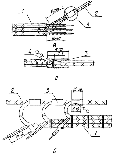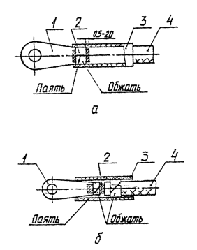 2.1.3.8. Оконцевание жилы кабельным наконечником, закрепляемым пайкой, выполняют по черт. 10. При оконцевании по черт. 10а жилу провода вставляют в наконечник так, чтобы длина участка между наконечником и изоляцией была в пределах 0,5-2,0 мм. Установленный наконечник обжимают на жиле, после чего производят пайку (см. п. 2.2.8, 2.2.10). Оконцевание жил проводов кабельным наконечником 1 - кабельный наконечник; 2 - жила провода; 3 - маркировочная бирка; 4 - изоляция провода Черт. 10 Оконцевание жил проводов кабельным наконечником по ТУ 5.986-5069-74