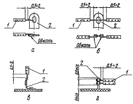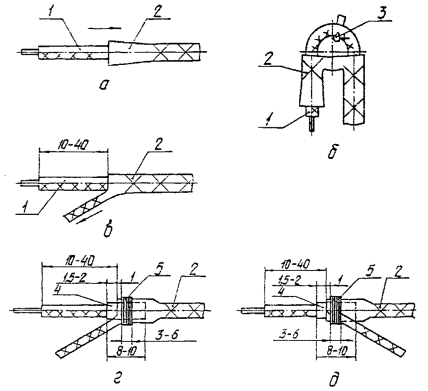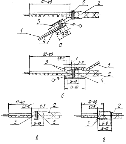 Черт. 12 При оконцевании по черт. 10б наконечник закрепляют на жиле и изоляции провода. При обжатии наконечника на изоляции не допускается её повреждение. Форма поперечного сечения опрессованной жилы должна соответствовать черт. 11, а размеры таблице. В случае выхода размеров опрессованной части за допустимые пределы, приведенные в таблице, необходимо произвести регулировку клещей. 2.1.3.10. Опрессовку кабельных наконечников по ТУ 36.22.22.010-88 следует производить клещами КО по ТУ 36.22.22.009-88 согласно "Инструкции по эксплуатации" дт 4.094.043ИЭ. Форма поперечного сечения спрессованной жилы должна соответствовать черт. 12, а размеры таблице. 2.1.4. Разделка экранов проводов 2.1.4.1. Выбор конструкции разделки и присоединения экранов проводов следует производить, исходя из условий их монтажа. 2.1.4.2. При использовании экрана в качестве нулевого защитного проводника рекомендуется следующий способ разделки экранированного провода (черт. 13). Экран сдвигают в направлении, указанном стрелкой (черт. 13а). Далее провод перегибают и в месте перегиба раздвигают пряди экрана. Через образовавшееся отверстие извлекают конец провода с помощью монтажного крючка (черт. 13б). При этом не допускаются обрывы проволочек экрана в месте выхода из него провода. Свободный конец экрана следует вытянуть в направлении, указанном стрелкой (черт. 13в). Способы разделки экранированного провода 1 - провод; 2 - экран; 3 - монтажный крючок; 4 - поливинилхлоридная трубка; 5 - нитяной бандаж Черт. 13 Экран в месте выхода конца провода сдвигают на 15-20 мм в сторону длинного конца провода и на длину 8-10 мм надевают отрезок поливинилхлоридной трубки ГОСТ 19034-82, либо можно подмотать 1 слой изоляционной ленты ПВХ ГОСТ 16214-86. Затем экран сдвигают в первоначальное положение так, чтобы трубка или лента выступали на 1,5-2 мм. Поверх экрана накладывают нитяной бандаж шириной 3-6 мм. К свободному концу экрана припаивают кабельный наконечник (см. пп. 1.3.8-2.1.3.11) либо провод зануления (заземления) (черт. 14а). 2.1.4.3. При занулении (заземлении) экрана с помощью отдельного проводника рекомендуется следующий способ разделки экранированного провода (черт. 14). Конец экрана обрезают на длину 10-40 мм, сдвигают в сторону длинного конца провода и на участке 8-10 мм надевают поливинилхлоридную трубку ГОСТ 19034-82, либо подматывают 1 слой изоляционной ленты НВХ ГОСТ 16214-86, затем экран сдвигают в первоначальное положение так, чтобы трубка или лента выступали на 1,5-2 мм. Отступив 1 мм от конца экрана, накладывают бандаж шириной 2-3 мм из жилы провода зануления (заземления) и припаивают бандаж к экрану (см. п.2.2.7, 2.2.9). На место пайки надевают поливинилхлоридную трубку длиной 12-15 мм. Допускается бандаж выполнять из лужёной проволоки ММ диаметром 0,12-0,15 мм по ГОСТ 2112-79. Способы разделки экранов проводов 1 - провод заземления; 2 - экран; 3 - поливинилхлоридная трубка; 4 - бандаж из проволоки; 5 - бандаж из ниток Черт. 14 2.1.4.4. В случаях, когда зануление (заземление) одного из концов экрана провода выполнять не требуется, разделку этого конца экрана рекомендуется выполнять следующим способом (черт. 14 в, г). Конец экрана обрезают на длину 10-40 мм, сдвигают его в сторону длинного конца провода и на участке 8-10 мм надевают поливинилхлоридную трубку по ГОСТ 19034-82, либо подматывают 1 слой изоляционной ленты ПВХ по ГОСТ 16214-86, затем экран сдвигают в первоначальное положение так, 