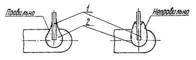 2.2.9. Количество припоя, необходимого для пайки, должно быть минимальным. Пайку по возможности выполняют скелетной, т.е. так, чтобы под припоем был виден контур паяных выводов и проводов. Пример правильной и неправильной пайки показан на черт. 22. Время пайки не должно превышать 5 с, если в НТД на устройства не оговорено других ограничений. По возможности следует избегать повторных паек. Не допускается механическое воздействие паяльником на места паек. Допускается применение других материалов и способов, не снижающих качество очистки. Моющая жидкость не должна попадать внутрь устройств. Поверхность припоя должна быть гладкой, без темных пятен и посторонних включений. Количество припоя, необходимого для пайки, должно быть минимальным. Поверхности соединений после пайки должны быть очищены от остатков флюса и нагара и покрыты лаком Нц-134 ТУ 6-10-1291-86 с цветным наполнителем. Примеры выполнения пайки