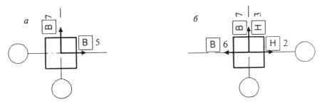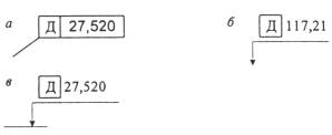 а - сваи или колонны на плане; б - колонны на разрезе Рисунок 2 - Примеры указания действительных отклонений поверхностей Отклонения точек плит перекрытий и подобных поверхностей от их самых высоких точек показываются числовым значением в мм со знаком "минус" с направляющей линией. 4.6.4 Уклоны поверхностей и линейных элементов показываются по ГОСТ 21.101; крутизна откосов показывается по ГОСТ 21.508. При этом перед действительными числовыми значениями помещается буква "Д" в прямоугольной рамке. 4.6.5 Действительные отклонения осей элементов от разбивочных осей на планах показываются стрелками, направленными в сторону отклонения, и расположенным рядом числовым значением отклонения. При этом перед действительными числовыми значениями отклонений помещается в прямоугольной рамке буква "В" для верхнего сечения или буква "Н" для нижнего сечения элемента (рисунок 3).