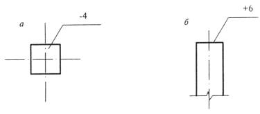 а - конструкции на плане; б - грунтовой или другой поверхности рельефа на плане; в - любой поверхности на разрезе Рисунок 1 - Обозначение действительной отметки поверхности 4.6.3 Действительные отклонения от проектных отметок показываются числовым значением в см для грунтовых и других поверхностей рельефа и в мм - для других элементов со знаком "плюс" в случае превышения или "минус" в случае занижения. Направляющую линию соединяют с точкой поверхности, к которой относится отклонение (рисунок 2).