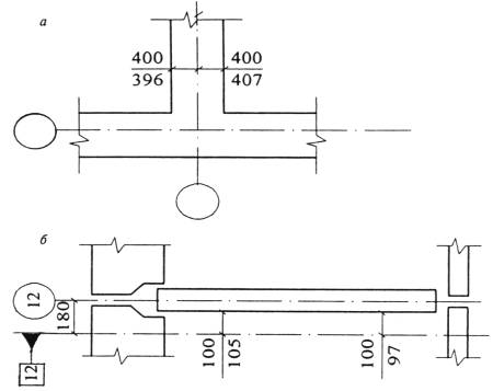а - сваи; б - колонны Рисунок 3 - Примеры указания действительных отклонений осей элементов от разбивочных осей на плане Действительные расстояния от граней элемента до разбивочных осей показываются в соответствии с 4.6.1 (рисунок 4).