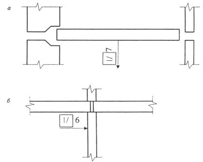 а - от граней монолитного ростверка до разбиваемой в натуре координационной оси; б - от грани стеновой панели до разбиваемой в натуре параллели оси Рисунок 4 - Примеры указаний действительных расстояний на плане 4.6.6 Действительные отклонения поверхностей элементов от вертикальности показываются стрелками, направленными в сторону отклонения, и расположенными рядом условными обозначениями невертикальности по ГОСТ 21.113 и числовыми значениями отклонений (рисунок 5).