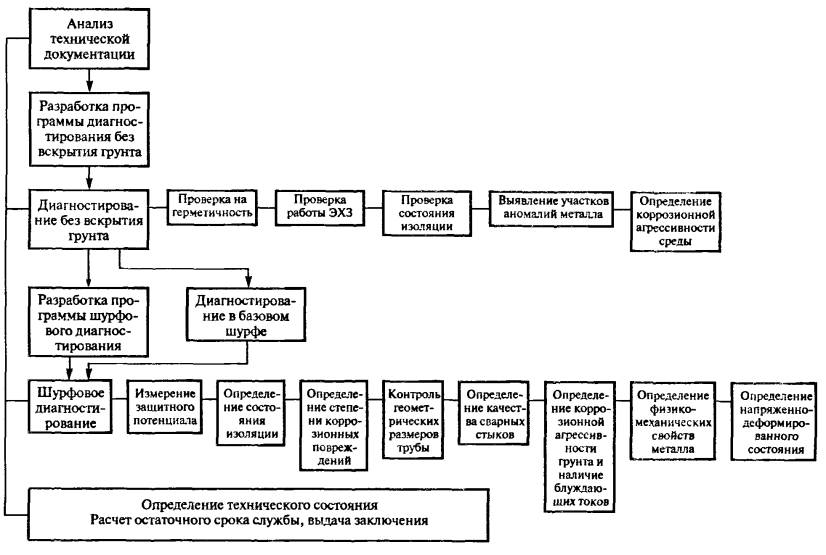 где di - наибольший размер коррозионной язвы по верхней кромке, мм; smах = 0,75sТ. Пример расчета остаточного срока службы при наличии язвенной (питтинговой) коррозии приведен в приложении Е. 7. АНАЛИЗ РЕЗУЛЬТАТОВ ДИАГНОСТИРОВАНИЯ ГАЗОПРОВОДАЦель анализа результатов диагностирования - установление текущего состояния газопровода, уровня повреждений, напряженного состояния и остаточного срока службы газопровода. Остаточный срок службы принимается наименьшим из полученных по расчетам, приведенным в пп. 6.4-6.7. 8. ОФОРМЛЕНИЕ РЕЗУЛЬТАТОВ ДИАГНОСТИРОВАНИЯ ГАЗОПРОВОДА8.1. На выполненные работы по диагностированию технического состояния газопровода организация, их проводящая, составляет первичную документацию (акты, заключения, протоколы, таблицы, фотографии и др.), где отражаются все недостатки, обнаруженные повреждения и дефекты. На основании первичной документации о результатах диагностирования, выполнения расчетов и при необходимости ремонта газопровода составляется отчет. 8.2. Отчет состоит из следующих разделов: введение - краткая постановка задач; основные сведения о диагностируемом газопроводе (конструкция, технология строительства, рабочие параметры эксплуатации, материал труб и изоляционного покрытия, оборудование ЭХЗ, грунтовые условия, сведения об эксплуатации, ремонте); результаты анализа технической документации; выводы и рекомендации по результатам предыдущих плановых обследований и диагностирования; результаты текущего технического диагностирования; специфические особенности эксплуатации (если таковые имели место); результаты внеочередного диагностирования (если таковые проводились); расчет остаточного срока службы; заключение; выводы и рекомендации с указанием причин, послуживших основанием для проведения или не проведения ремонта или реконструкции газопровода, а также указания о технических и организационных мероприятиях, необходимых для обеспечения дальнейшей безопасной эксплуатации. 8.3. Отчет (заключение по результатам диагностирования) оформляется установленным порядком и прикладывается к техническому эксплуатационному паспорту подземного газопровода (приложение А). 9. ПЕРЕЧЕНЬ РЕКОМЕНДУЕМОГО ПРИБОРНОГО ОСНАЩЕНИЯ ДЛЯ ДИАГНОСТИРОВАНИЯ ПОДЗЕМНЫХ ГАЗОПРОВОДОВ9.1. Диагностирование с поверхности земли (без вскрытия) осуществляется следующим оборудованием. Определители утечки газа: а) ЛОУГ (передвижная лаборатория); б) Вариотик; в) ГИВ-М. Измерители потенциалов электрохимической защиты: а) Мультиметр 43313 ЭВ 2234; б) АИП; в) ПКИ-2 (измерительный комплекс). Проверка сплошности изоляционного покрытия на засыпанных участках газопровода: а) АНПИ; б) КАОДИ; в) ИПИ-95; г) ТИЕТИ-03; д) ИПИТ-2; е) «Поиск-2»; ж) АНТПИ (У); з) C-Scan; и) ТИСПИ. Определитель участков дефектов и напряжений: а) ИДН. 9.2. Контактное (шурфовое) диагностирование на вскрытом участке (очищенном от грунта) осуществляется следующим оборудованием. Измерение коррозионной агрессивности грунта: а) ИКАГ; б) АКГК. Определение толщины и адгезии изоляции: а) АР-2; б) СМ-1; в) УКТ-2; г) ИА-1; д) УКАП-1-100; е) АМЦ2-20. Контроль глубины коррозии (остаточной толщины стенки трубы): а) УТ-93П; б) УТ-65М; в) «Кварц». Определение дефектов металла труб: а) Уд-2-12. Определение мест концентрации напряжений: а) ИКН-1М; б) ИКН-1М-4. Контроль качества сварных стыков: а) ИКН-1М; б) ИКН-1М-4; в) МИРА 2Д. Измерение 