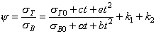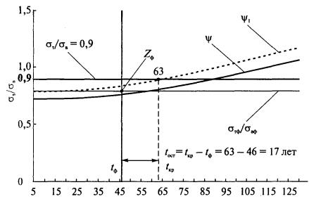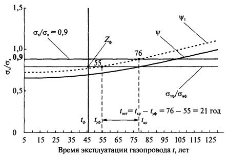 Значения коэффициентов k1 и k2 для расчета пластичности при эксплуатации газопровода в условиях, отличных от базовых, вычисляются по формулам: при изменении данных по температуре k1 = (aтТф + bт + стt)DТ, (5) при изменении данных по давлению k2 = 0,000625tDP, (6) где DТ, °С и DР, МПа - разность среднегодовой температуры грунта Тф на уровне заложения газопровода и действующего давления Рф от базовых значений (20 °С и 1,2 МПа): DТ = Тф - 20 °С; DР = Рф - 1,2; aТ, bТ, сТ - параметры, учитывающие влияние изменения температуры на пластичность, принимаются по табл. 3. Определение остаточного срока службы, представленное на рис. Е.1 и Е.2 приложения Е, производится путем построения при помощи ПЭВМ графика функции y, формула (4), с интервалом точности (+10 %) в виде двух кривых: y и y1 - верхней границы 10 %-ного интервала точности кривой y в координатах «sт/sв - время» и двух прямых, построенных в тех же координатах, параллельных оси абсцисс: sт/sв = 0,9 и sт/sв = sтф/sвф. Значения sтф и sвф получены по данным шурфового контроля согласно п. 5.5 в ходе диагностирования. Таблица 3 Параметры для расчета фактических механических свойств металла по пластичности