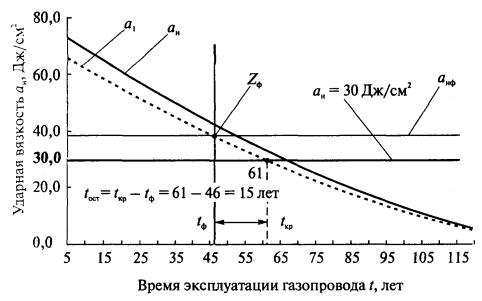 Примечание. Параметры таблицы определяются на основе имеющихся экспериментальных данных путем их аппроксимации и в соответствии с критерием подобия процессов деформирования и разрушения металлов одной группы и постоянно уточняются при получении новых данных. Примеры расчета остаточного срока службы по изменению пластичности металла приведены в приложении Е. 6.5. Расчет остаточного срока службы газопровода по изменению ударной вязкости металла. Снижение трещиностойкости (ударной вязкости) металла труб в результате старения, т.е. зависимость ударной вязкости ан от времени эксплуатации газопровода можно представить в виде где g, h, m, t, l, b - параметры, отражающие процесс старения относительно исходного значения ударной вязкости aн0, приведены в табл. 4. Исходное значение ударной вязкости ан0 выбирается по данным базового шурфа или по табл. 2. При эксплуатации газопровода в условиях, отличных от базовых, расчетные значения ударной вязкости изменяются на величину поправочных коэффициентов К3 и К4, которые определяются по формулам: при отличии температуры Тф от базовой (Тф ¹ 20 °C) К3 = (nТТф + mT + uTtф)DТ (8) и при отличии давления от базового Р ¹ 1,2 МПа (для СУГ - 1,6 МПа) К4 = -0,08867tфDР, (9) где nТ, mT, uT - параметры, учитывающие влияние изменения температуры на ударную вязкость (приведены в табл. 4). И тогда анф = ан0 + К3 + К4, (10) где анф - фактическая величина ударной вязкости материала в точке замера, Дж/см2. Определение остаточного срока службы, представленное на рис. Е.3 и Е.4 приложения Е, производится путем построения при помощи ПЭВМ графика функции ан, формула (7), с интервалом точности (-10 %) в виде двух кривых: ан, формула (7), и а1 - нижней границы 10 %-ного интервала точности кривой ан в координатах «ударная вязкость - время» и двух прямых, построенных в тех же координатах, параллельных оси абсцисс: ан = 30 Дж/см2; ан = анф. Значение анф получено по данным шурфового контроля согласно п. 6.5 в ходе диагностирования. Пусть tкр - абсцисса точки пересечения кривой а1 с прямой ан = 30 Дж/см2. Определяем точку пересечения прямых t = tф и ан = анф. В случае, когда указанная точка попадает в интервал точности функции по формуле (7) или в область над кривой ан, разность tкр - tф дает искомую величину остаточного срока службы tост = tкр - tф. Если же полученная точка окажется за пределами интервала точности (в области под кривой а1), следует уточнить параметры табл. 4, используемых в функции формулы (7) или вместо tф использовать для расчета условно-фактическое время эксплуатации газопровода tуф, равное абсциссе точки пересечения кривой a1 с прямой ан = анф. В этом случае tост = tкр - tуф. Таблица 4 Параметры, необходимые для определения ударной вязкости