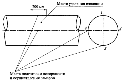 И.3.1. Для проведения замеров магнитно-шумовых сигналов с трубопровода удаляют наружную изоляцию по всему периметру (ширина кольца должна быть не менее 200 мм), а поверхность замера в форме круга диаметром не менее 50 мм согласно схеме, приведенной на рис. И.4, зачищают шлифовальной шкуркой.